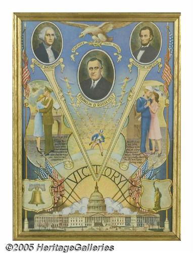 <B>Two World War II FDR Colorful Patriotic Framed Posters</B></I> We have never handled either one of these posters previously. The first has portraits of Franklin D. Roosevelt (top), George Washington and Abraham Lincoln surrounding Uncle Sam playing the fife alongside a soldier and a sailor on drums through a large "V" for Victory against a field of battle scenes. Copyright 1942 by C. M. Holsinger, attractive modern frame, sight size 13" x 17.5". The second item is similar with the same three Presidents pictured and using every patriotic theme imaginable including "Remember Pearl Harbor," the Statue of Liberty, the Liberty Bell, the White House, "V" for Victory, Uncle Sam, and the eagle. Sight size is 12.5" x 17", modern frame. These are fabulous, visually exciting posters from the beginning of our involvement in World War II, worthy of any collection. Lot:263