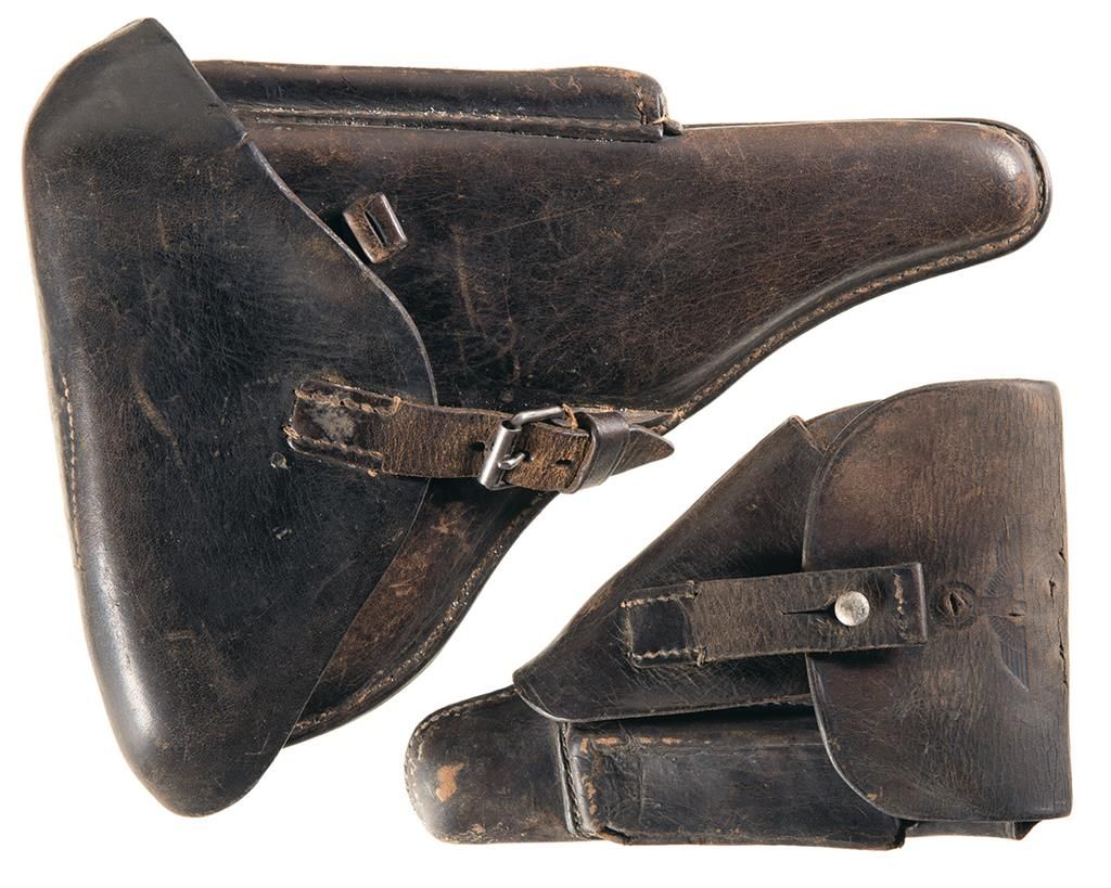 1) 1936 dated Lederwarenwerk Luger leather holster with takedown tool and aluminum base blue magazine (very good). 2) PPK leather holster with spurious eagle/swastika stamped on flap (fair).