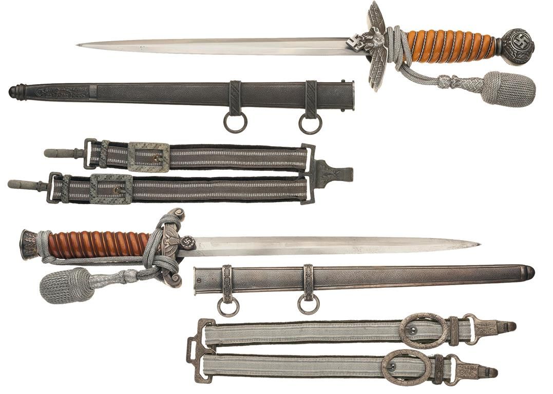 1) E & F Horster 2nd Pattern Luftwaffe Dagger, 15 3/8" overall with a 10 inch blade, alloy fittings, yellow celluloid grip and silver portapee. With darkened metal scabbard and hanger with square buckles. 2) Ernst Pack "Siegfried Waffen" Heer Dagger, 14 3/4 inches long, 9 3/4 inch blade, nickel fittings, orange celluloid grip and silver portapee. With darkened scabbard and hanger with oval buckles.