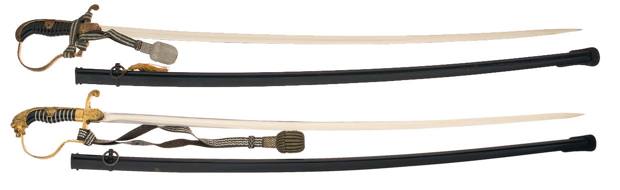 1) F.W. Holler (Solingen) officer's sword, 32" single fuller blade, with the maker's mark on the left ricasso, Nazi eagle on the right languet, oak leaf decorated guard and pommel and a wire wrapped celluloid grip. With a green leather and silver wire portapee, silver acorn and a black painted metal sheath. 2) Eickhorn (Solingen) officer's sword, 33 1/4" single fuller blade, with "W.&L. SCHEBBER/ UNIFORMEN/ AACHEN" merchant mark on the right ricasso, Eickhorn on the left, "D.R.P." stamped on the guard, Nazi eagle on the right languet, wire and celluloid grip and lion head pommel with red eyes. Black leather and silver wire portapee, green and silver acorn and black painted metal sheath.