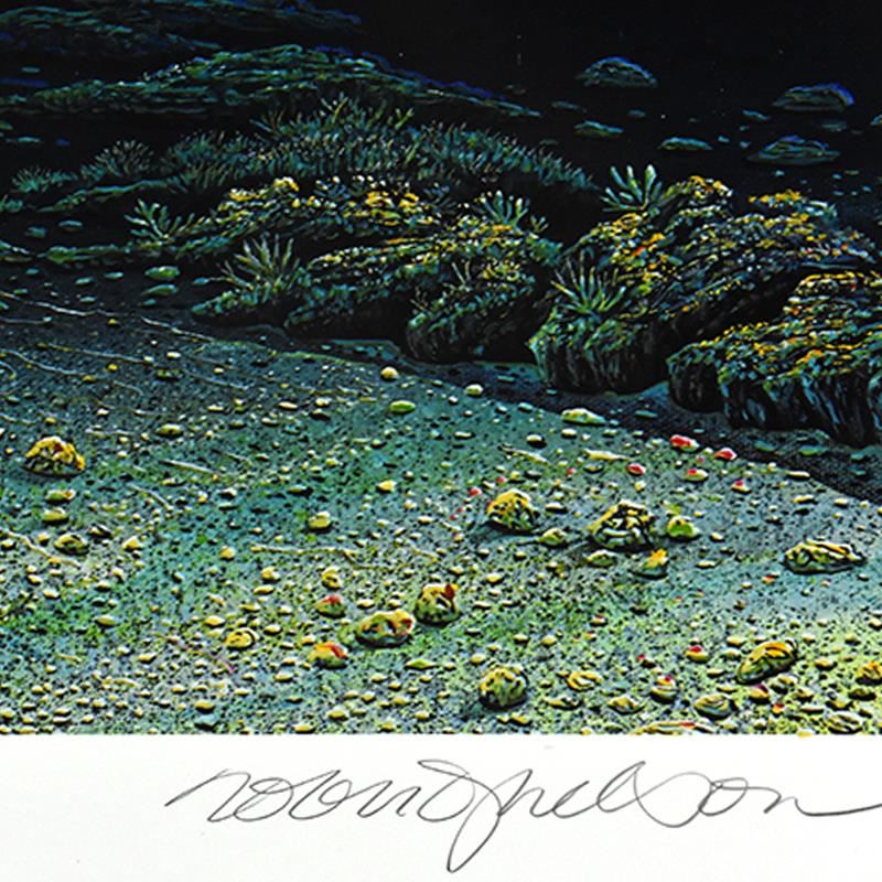 "Two Worlds Today" is a limited edition mixed media on paper by Robert Lyn Nelson, numbered and hand signed by the artist. Includes Letter of Authenticity. Measures approx. 21" x 35" (border), 16.5" x 30" (image).
