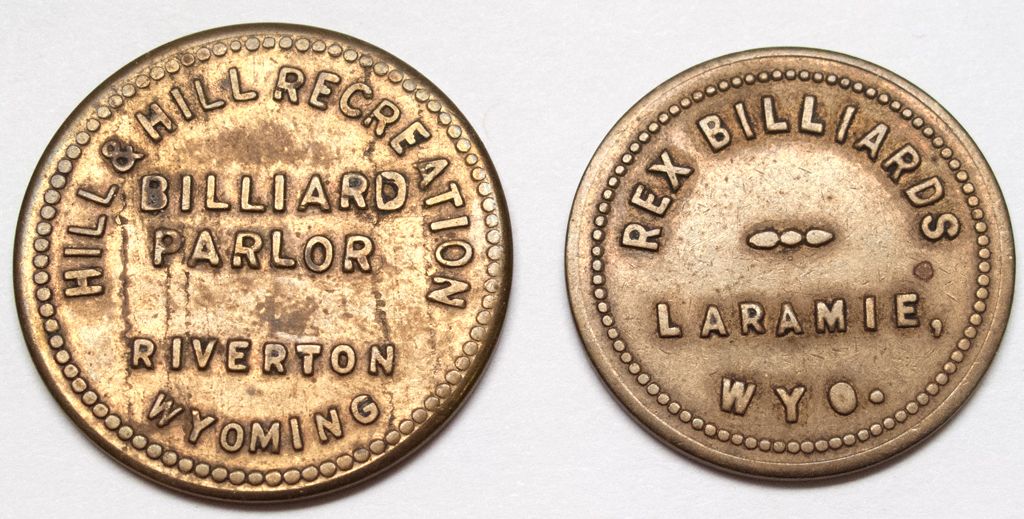 1) Hill & Hill Recreation / Billiard Parlor / Riverton / Wyoming // GF 10c IT. 2) Rex Billiards / Laramie / Wyo // GF 5c IT.