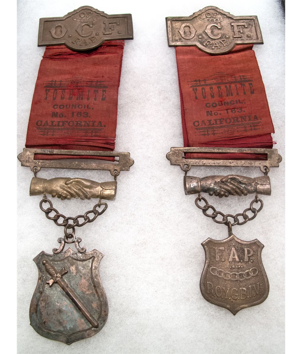 Two Yosemite Council badges from the Order of Chosen Friends.