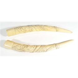 Two Zambian ivory tusks carved in relif with serpents and leopards, 43cm long