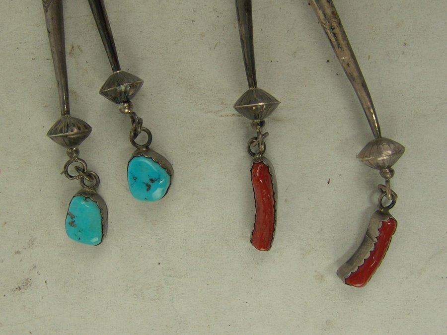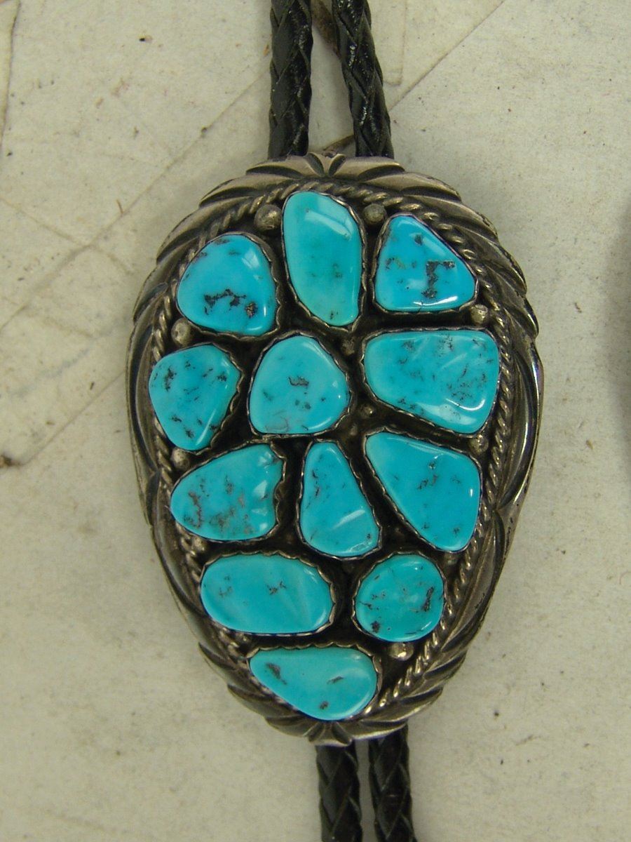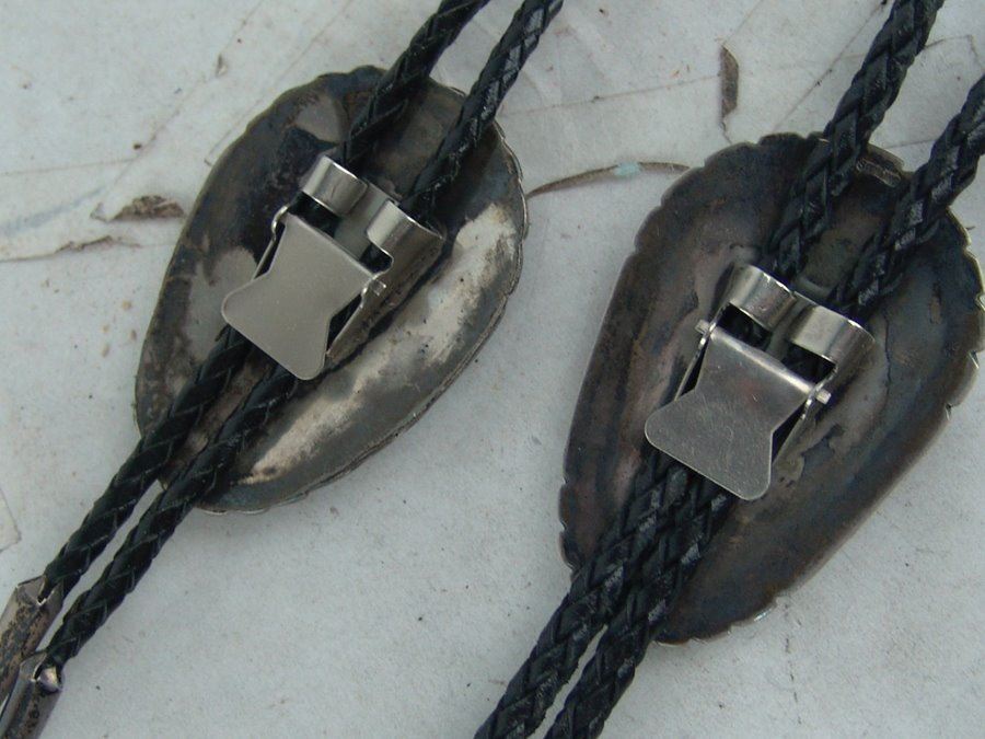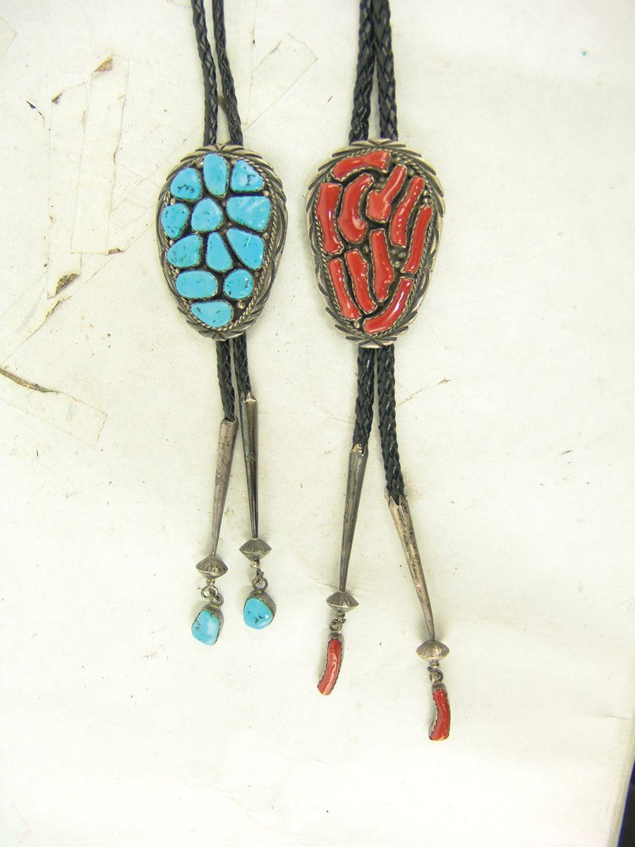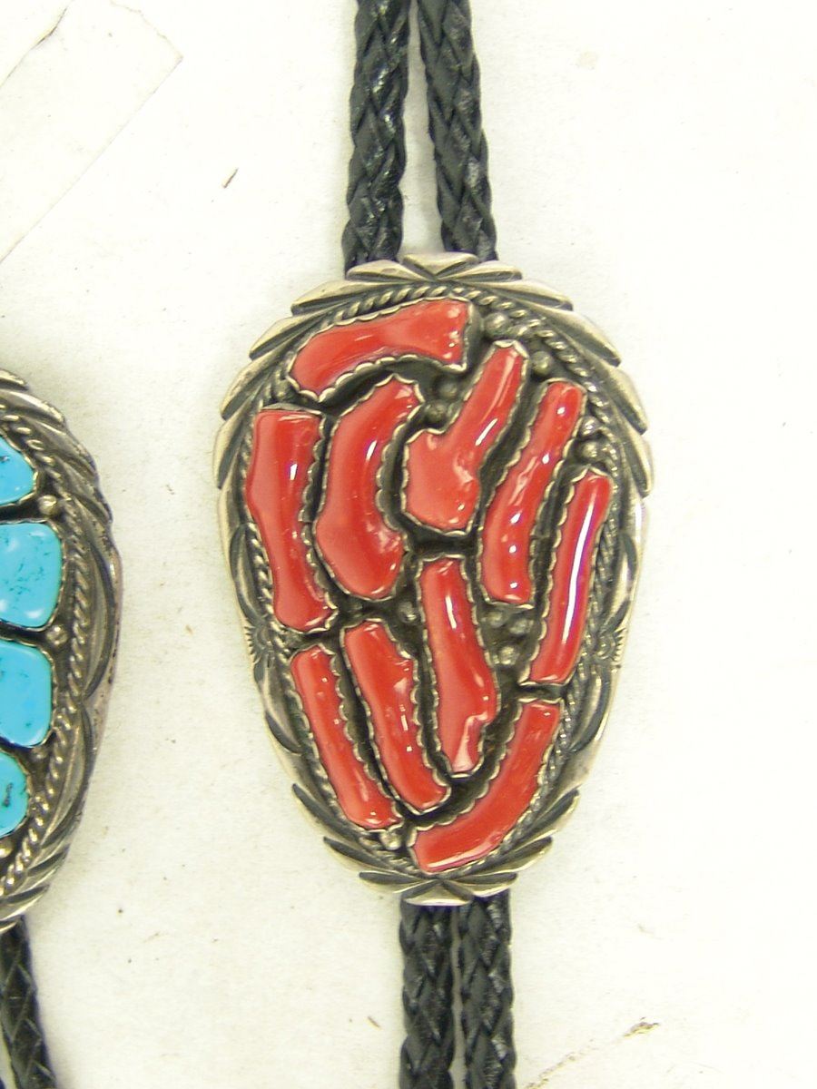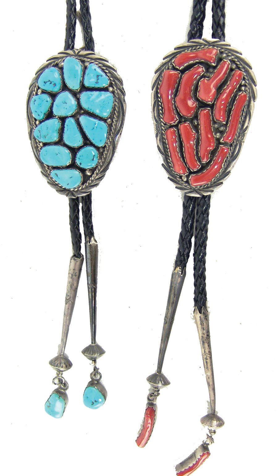 Wonderful pair of all silver bolo ties in ovalesque shape and with custom matching tips, one done with turquoise, the other with oxblood red coral. Both very good condition.,Ca. 1970s-1980s,2-5/8" x 1-3/4"
