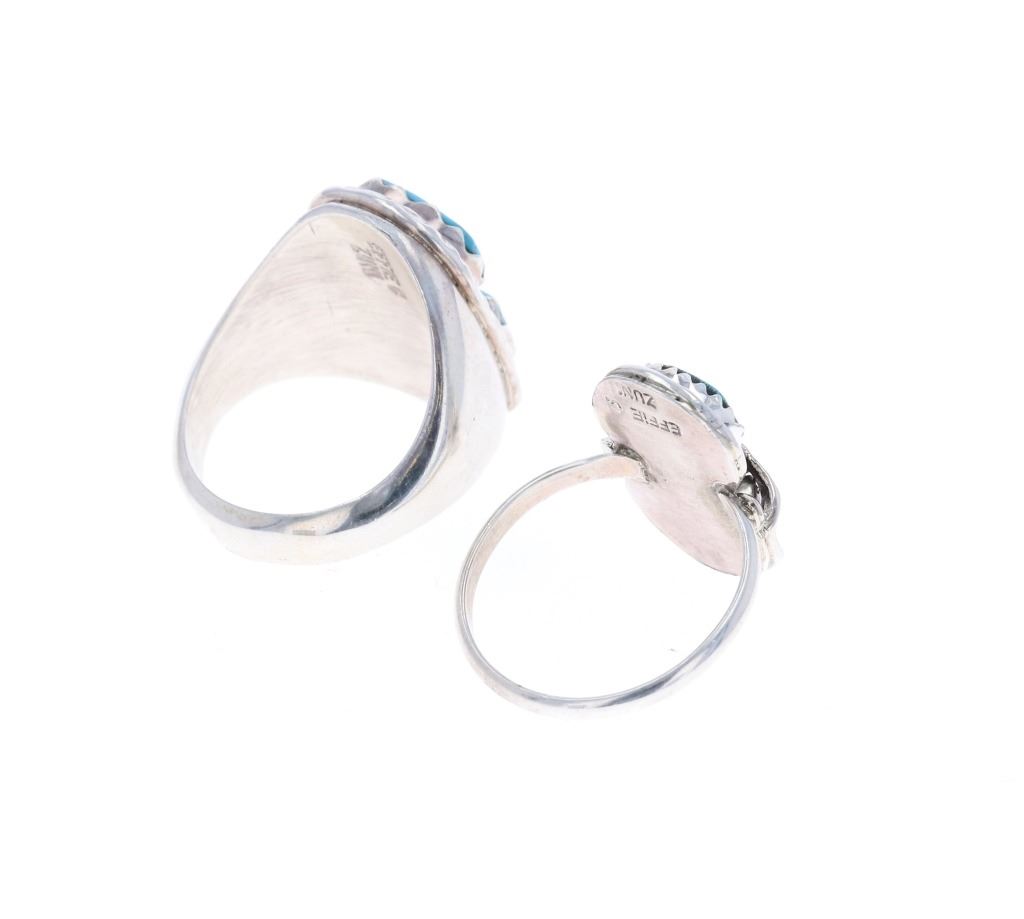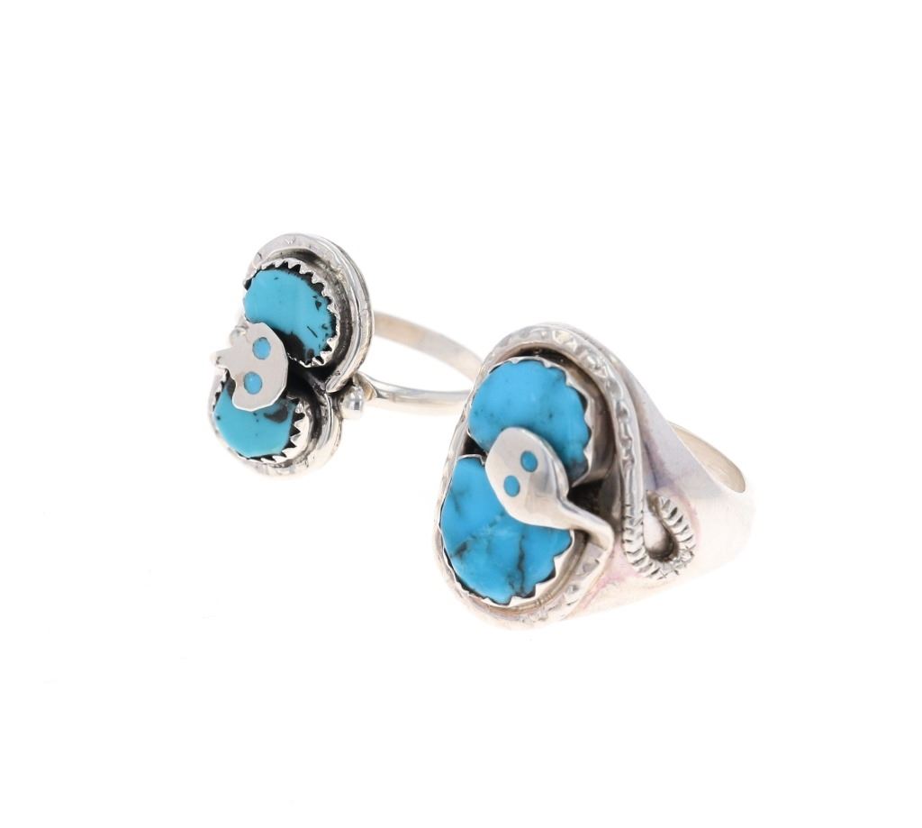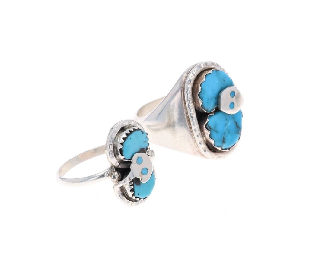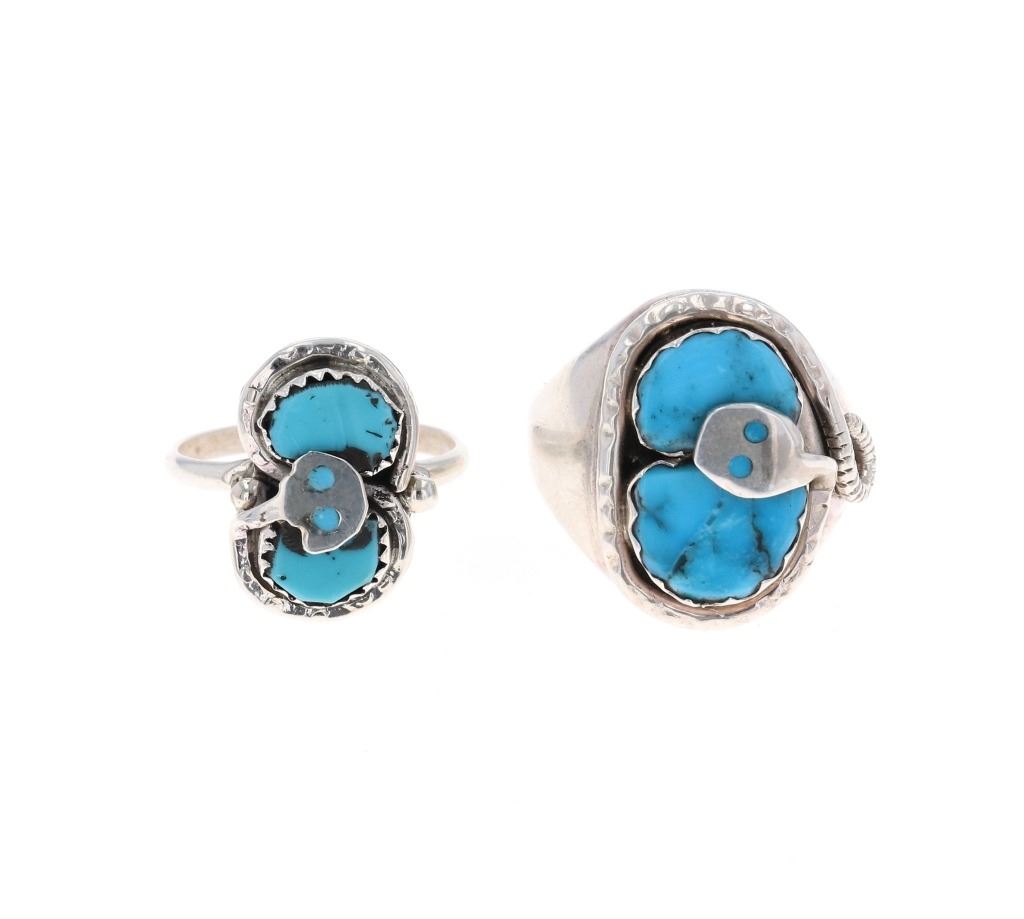 For your consideration are two Zuni Sleeping Beauty turquoise snake effigy rings done by Zuni silversmith Effie Calavaza. Effie Calavaza is a Zuni Silversmith whose work has captured the hearts of many collectors. She was born in 1928 and started making jewelry in her early years. Effie also went all the way to the Supreme Court of the United States of America to obtain full copyright of her art work to stop those from importing fake pieces of her work. Now in her 90's, Effie mostly supervises her daughters silverwork she has passed her designs down to her daughters. Her work is collected throughout the world. The first and larger ring shows a snake creating a shadow box for two Sleeping Beauty turquoise cabochons. The snake head features two small inlaid Sleeping Beauty turquoise cabochons for its eyes. The ring is stamped on the underside reading, "Effie C, Sterling". This ring measures 7/8" L x 7/8" W x 1" H and weighs 14.7 grams. The second smaller ring is also done by Effie Calavaza and features the same snake shadow box style with two Sleeping Beauty turquoise cabochons set in the center. The underside of the ring is stamped, "Effie C, Sterling". This ring measures 6/8" L x 6/8" W x 7/8" H and weighs 3.5 grams. Both rings show good condition with no signs of damage or wear. The large ring is sized US 8, while the small ring is size US 8 as well.