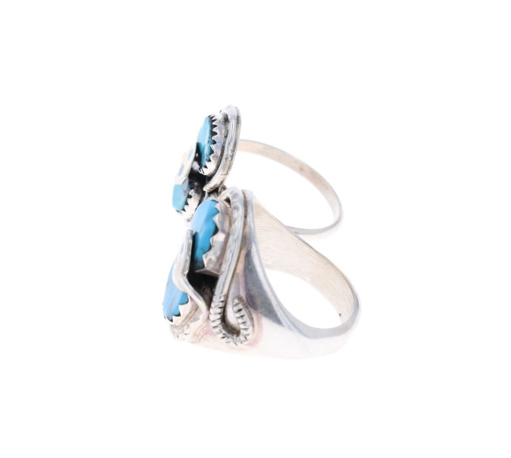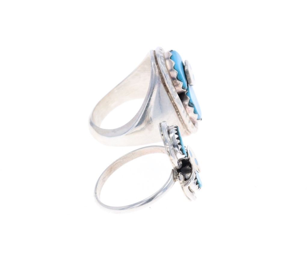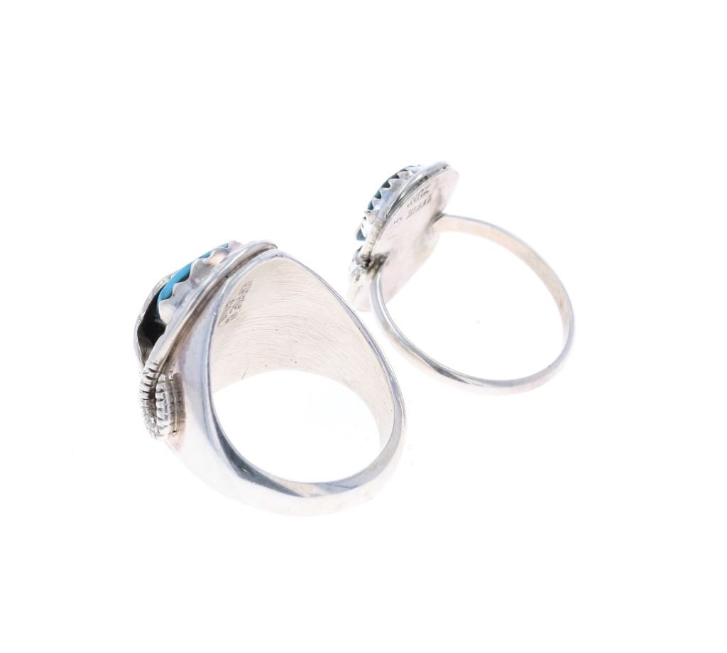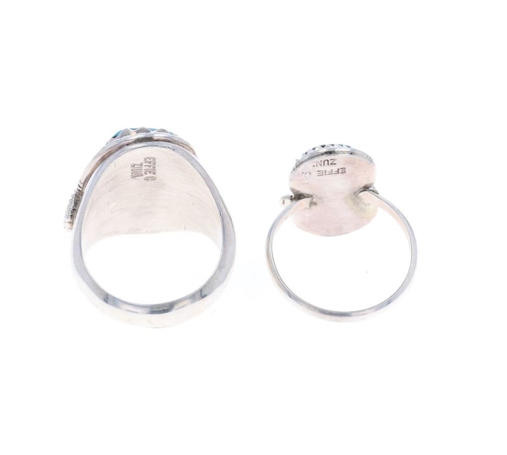 For your consideration are two Zuni Sleeping Beauty turquoise snake effigy rings done by Zuni silversmith Effie Calavaza. Effie Calavaza is a Zuni Silversmith whose work has captured the hearts of many collectors. She was born in 1928 and started making jewelry in her early years. Effie also went all the way to the Supreme Court of the United States of America to obtain full copyright of her art work to stop those from importing fake pieces of her work. Now in her 90's, Effie mostly supervises her daughters silverwork she has passed her designs down to her daughters. Her work is collected throughout the world. The first and larger ring shows a snake creating a shadow box for two Sleeping Beauty turquoise cabochons. The snake head features two small inlaid Sleeping Beauty turquoise cabochons for its eyes. The ring is stamped on the underside reading, "Effie C, Sterling". This ring measures 7/8" L x 7/8" W x 1" H and weighs 14.7 grams. The second smaller ring is also done by Effie Calavaza and features the same snake shadow box style with two Sleeping Beauty turquoise cabochons set in the center. The underside of the ring is stamped, "Effie C, Sterling". This ring measures 6/8" L x 6/8" W x 7/8" H and weighs 3.5 grams. Both rings show good condition with no signs of damage or wear. The large ring is sized US 8, while the small ring is size US 8 as well.