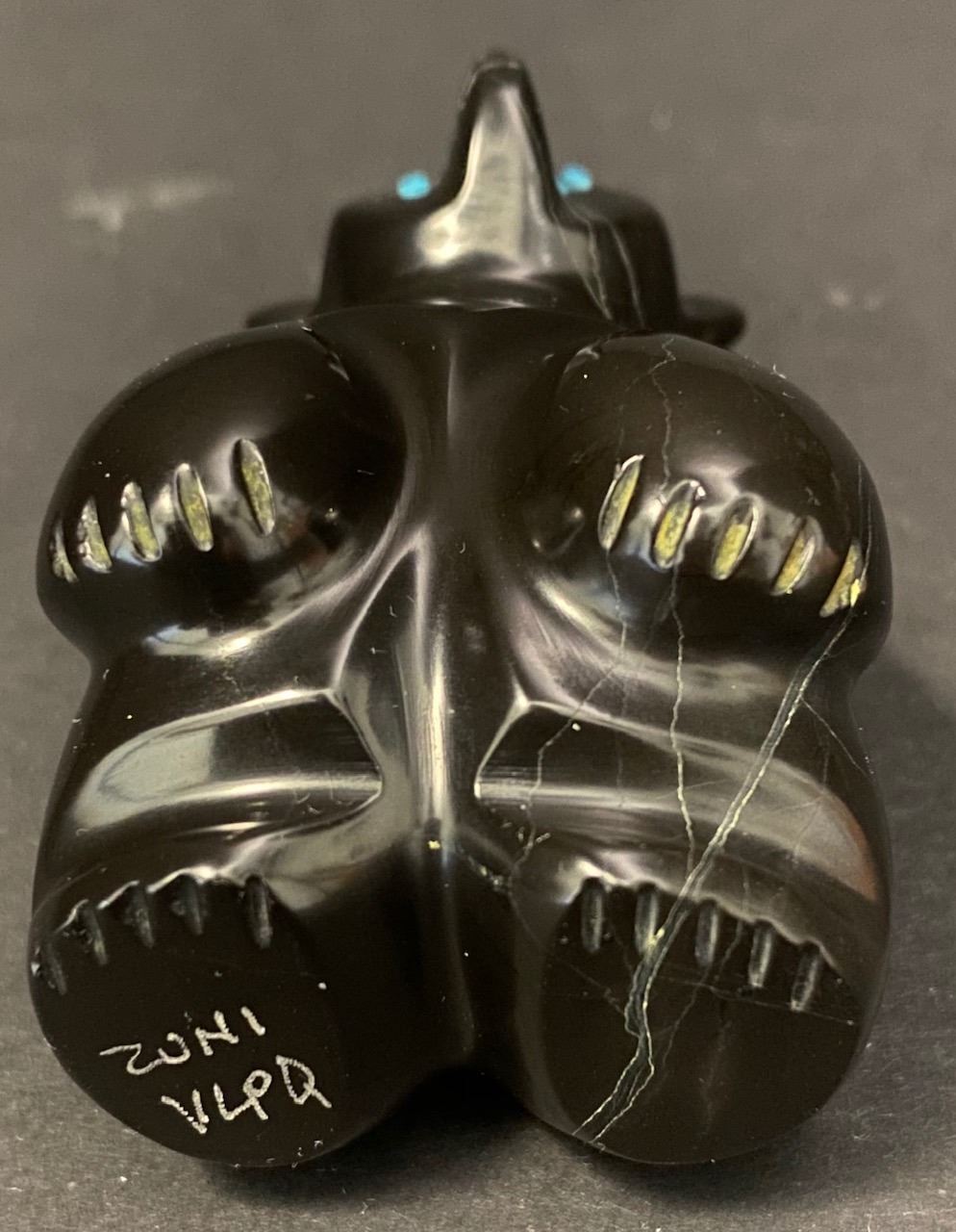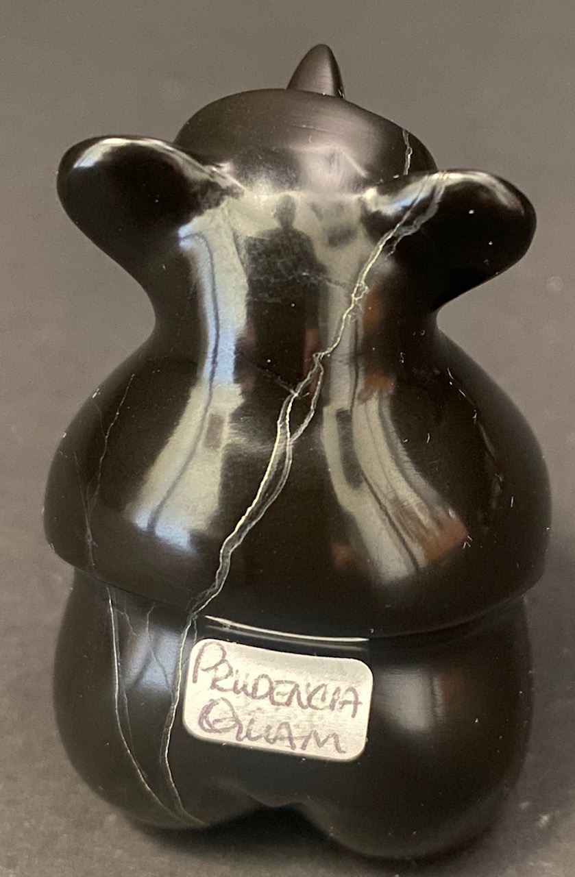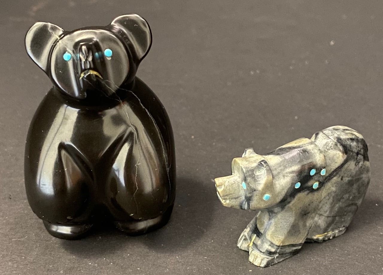 The 2nd is a Black Jet Bear by noted Artists Vernon Lunasee and Prudencia Quam. This Bear with Turquoise Eyes measures 2.25 inches tall and 1.25 inch long. Has old collectors tag. Is signed VLPQ