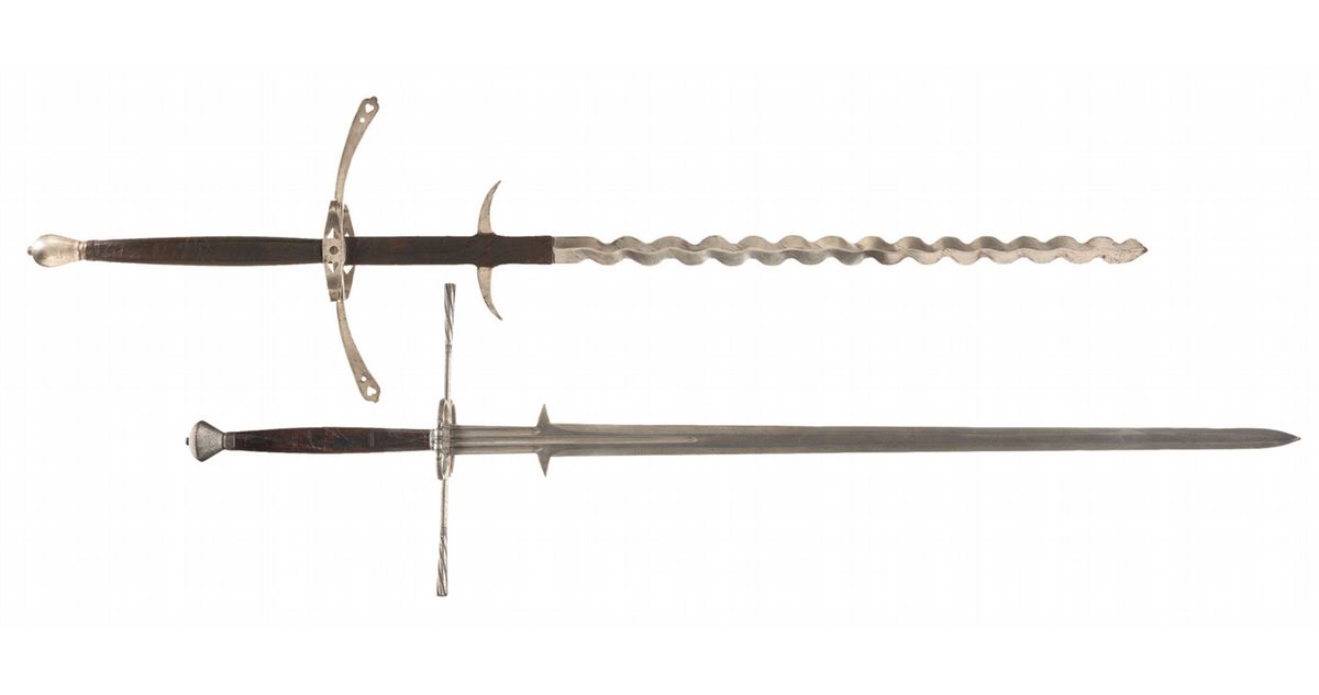 1) Measuring 69 inches overall, with a 51 inch flamberge blade, fitted with a pair of upturned 8 3/4 inch wide parrying hooks, and a leather wrap impressed with cross moline stamps extending up past the hooks. The hilt is equipped with an 18 1/2 inch wide crossguard and side rings, all showing punched-through heart and circle designs, leather wrapped octagonal hardwood grip, and a round pommel. Overall weight is 9.35 pounds. 2) Manufactured in the style of the late 15th or early 16th Century, this sword measures 65 inches overall, with a 50 1/2 inch double edged triple fuller blade, outfitted with a set of 4 1/2 inch wide guard spikes, engraved with geometric designs, and marked "ANDREA FERARA ME FECIT" (Andrea Ferara made me) in one of the fullers. This is most likely in imitation of the maker's mark of Andrea Ferrara, the semi-legendary Scottish maker. The hilt is equipped with side guard rings, 18 inch wide octagonal twist quillions, leather wrapped octagonal hardwood grip, and a conical pommel. Overall weight is 7.6 pounds. Provenance: The William Ashby Collection