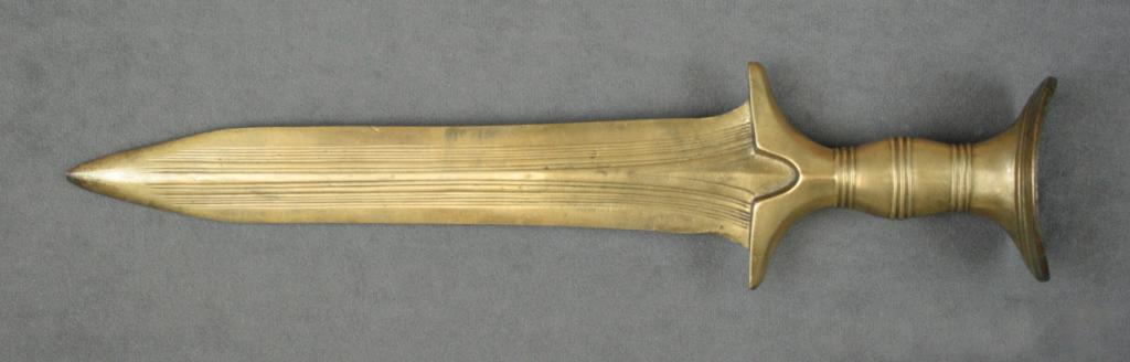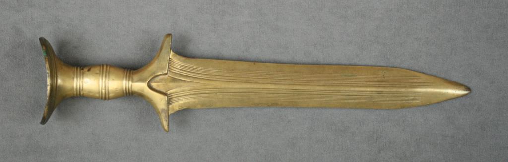 Two ancient style bronze weapons, one spear  head, one small knife. They have been  chemically cleaned and now difficult to  discern whether they are period or museum  copies. Sold as 19th century although theymay be period. From the Bernard Braverman  Estate. Est: $250 - $500