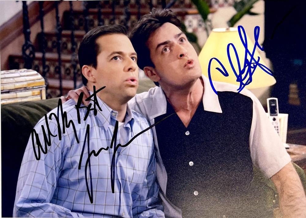 Two and a Half men cast facsimile signed photo autographed by Charlie Sheen and Jon Cryer. 8x10 inches. This item is a reprint of an original autograph