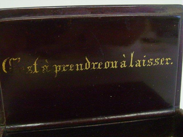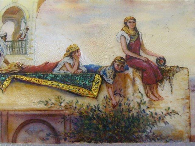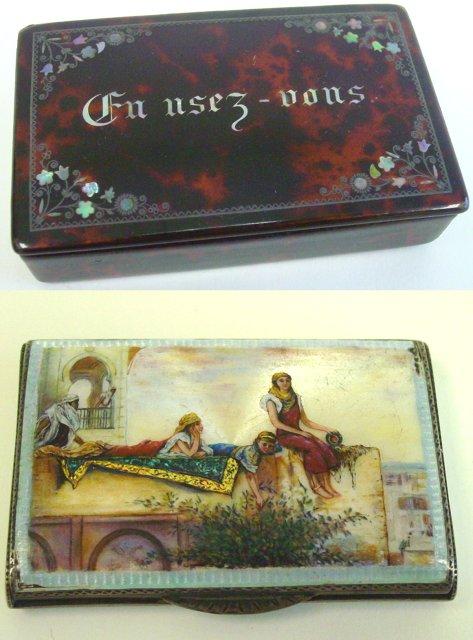 1- silver & enamel "Orientalist" , losses to enamel, approx. 3" W. 1- tortoise shell & mother of pearl, approx. 3 1/2" W.
