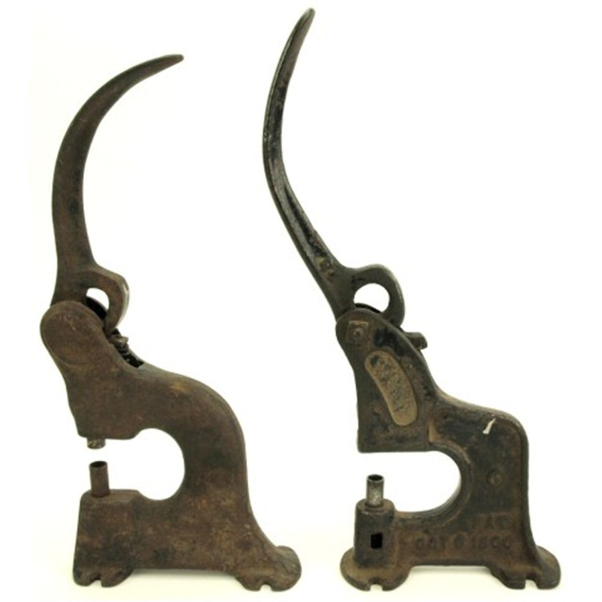 Two antique saddle shop riveters one marked Rex Oct 9 1900 the second unmarked.