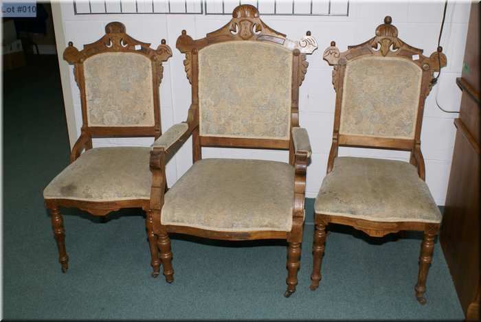 Two antique side chairs and one carver, all with matching upholstered seat and backs