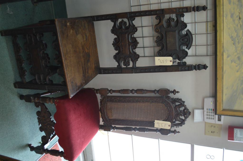 Two antique side chairs each with carved backs and supports and one with upholstered seat