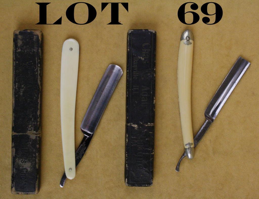 Two antique straight razors with period two piece boxes; the first is a Charles Adair, Danville, Ill. razor with faux ivory grip and good blade in correct Adair marked box; the other is a Mappin and Webb Sheffield hollowground blade in excellent condition with faux ivory grip contained in a Wyeth Hardware & Mfg. Co, St. Joseph, Mo. box. Est.: $50-$75.