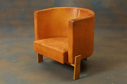 Two armchairs, leather, H 70, unknown design, cracked seem and stains.