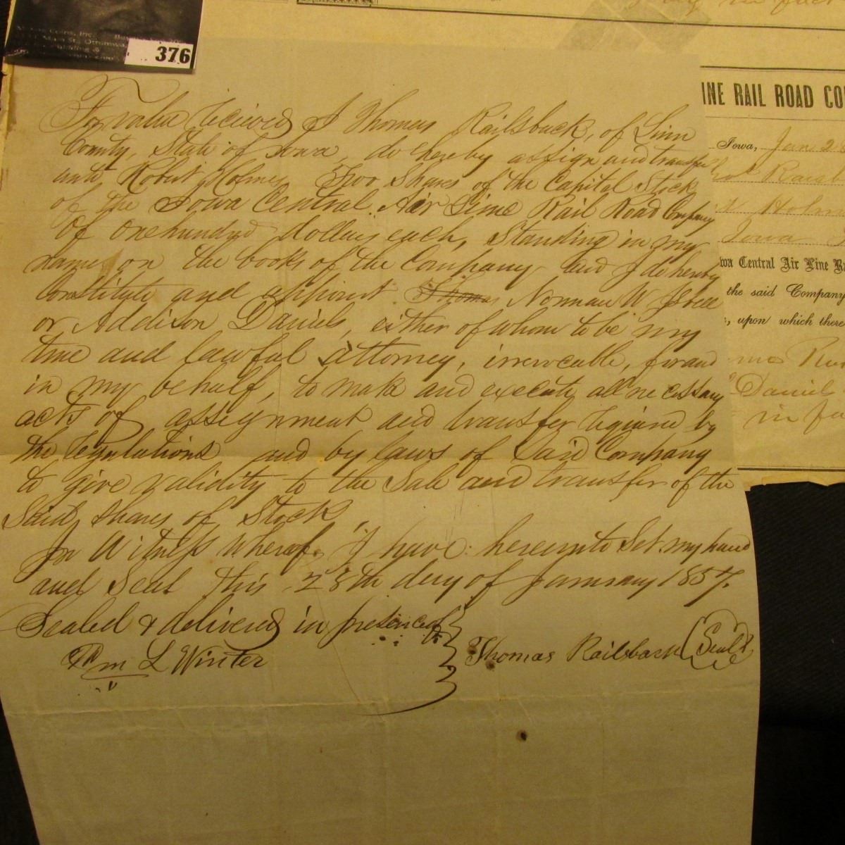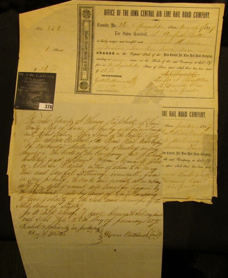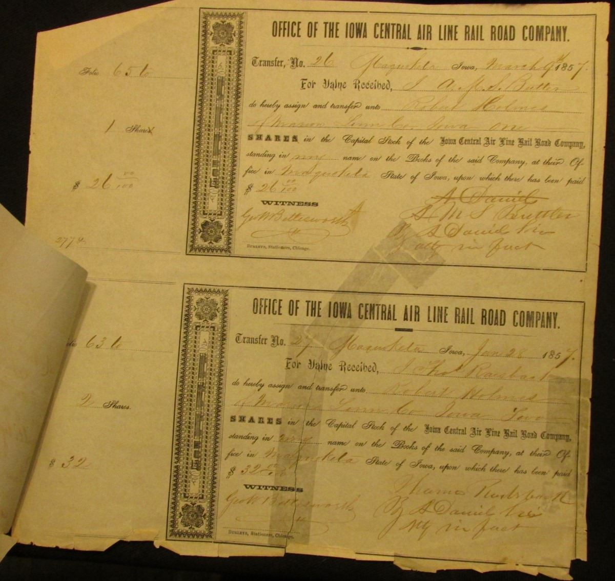 Two attached Certificates for Shares and a Stock Transfer in "Office of the Iowa Central Air Line Rail Road Company", Maquoketa, State of Iowa. March and January, 1857.
