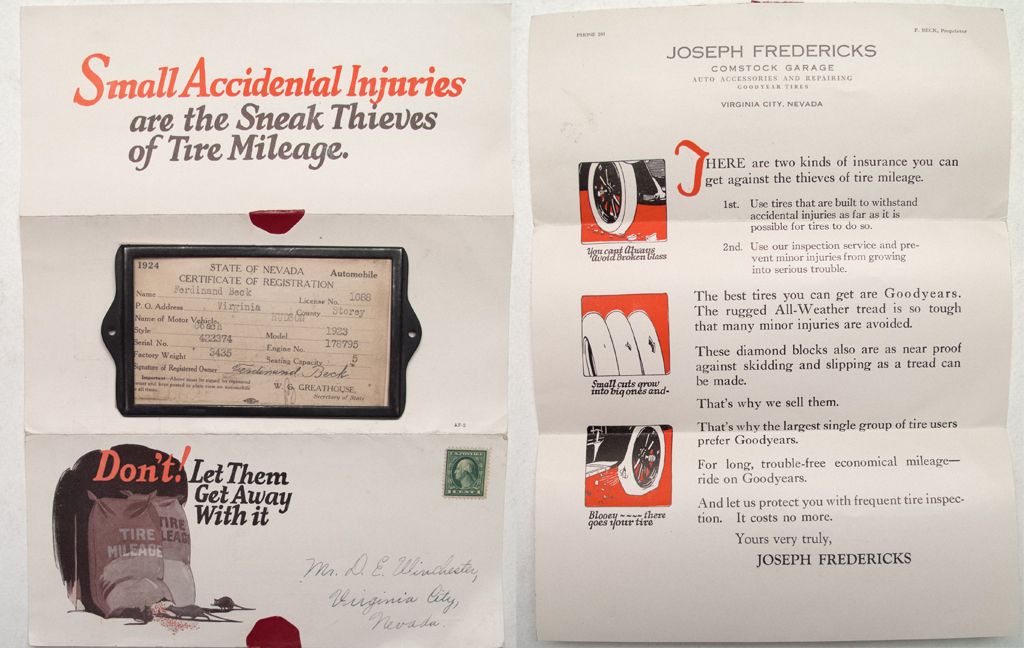 1) 1924 automobile certificate of registration for Ferdinand Beck for his 1923 Hudson. Ferdinand was a proprietor of a hardware store at one time. He was in Virginia City by 1875 as he and owner Joseph Fredericks stood on the roof of their store during the great fire to protect it. Which they did do! [Virginia City News online] 2) Also a 8x11 poster of Joseph Fredericks' Comstock Garage. Beck was proprietor. Poster advertises Goodyear Tires. Beck and Fredericks obviously had a long history together.