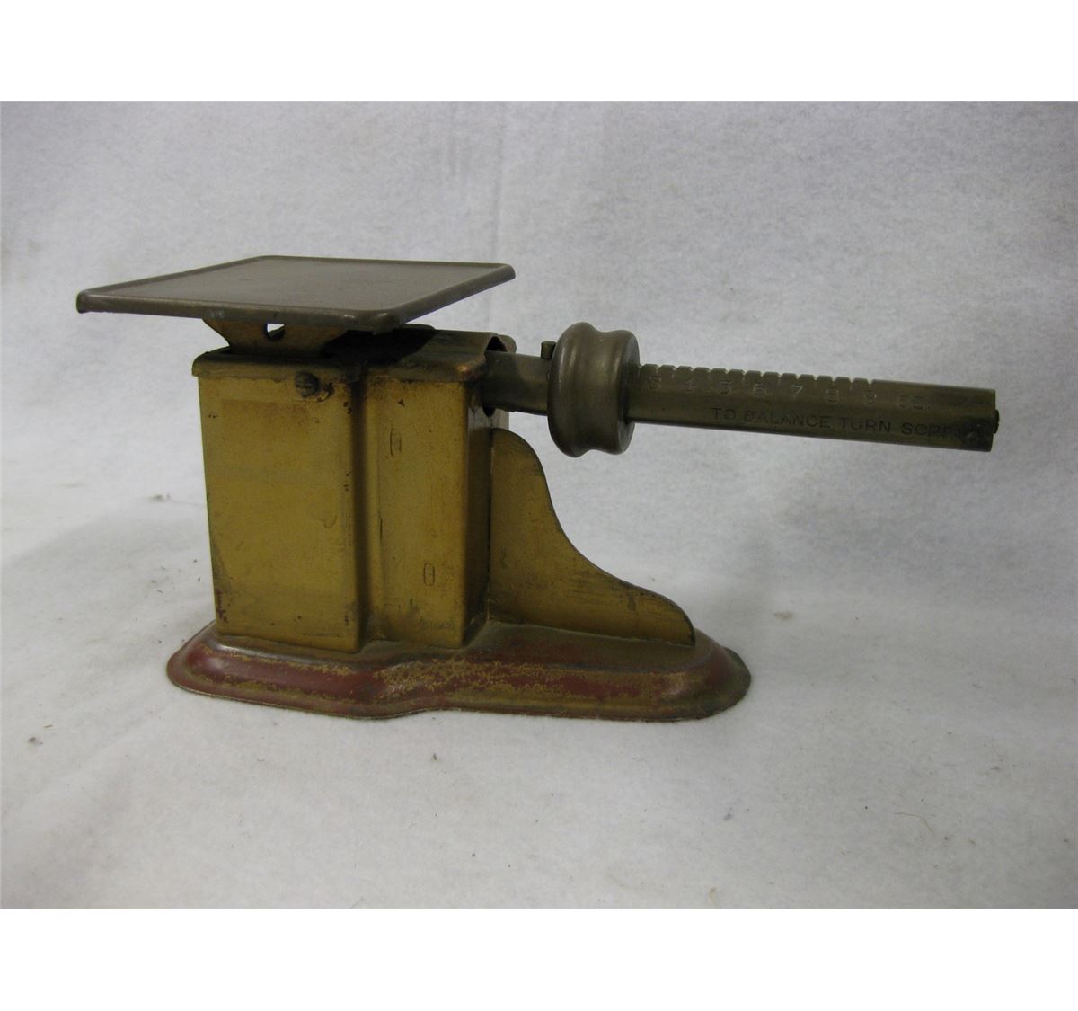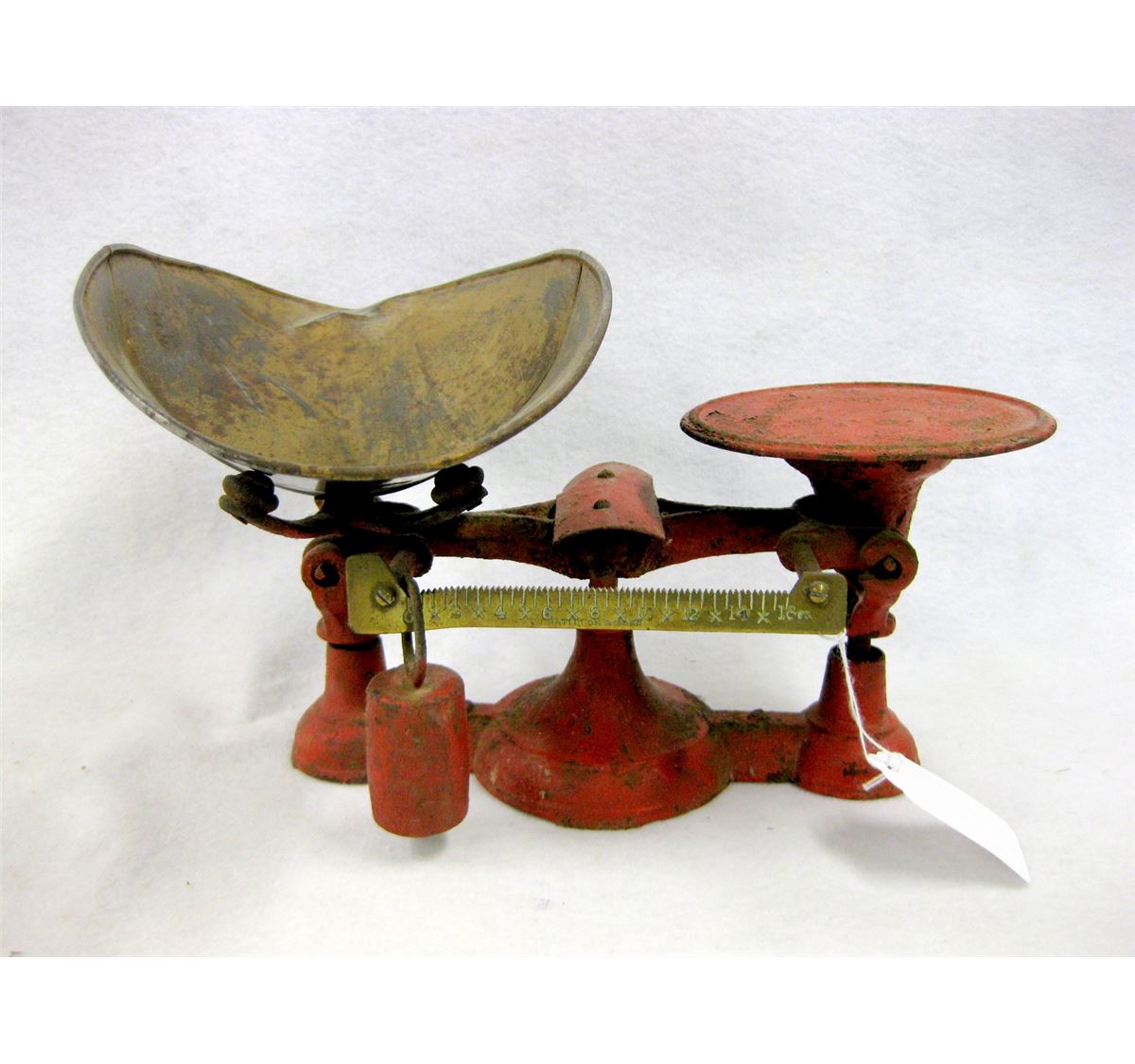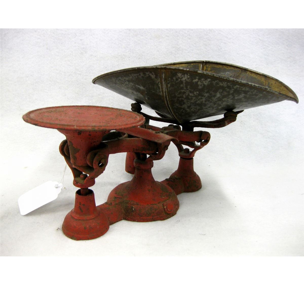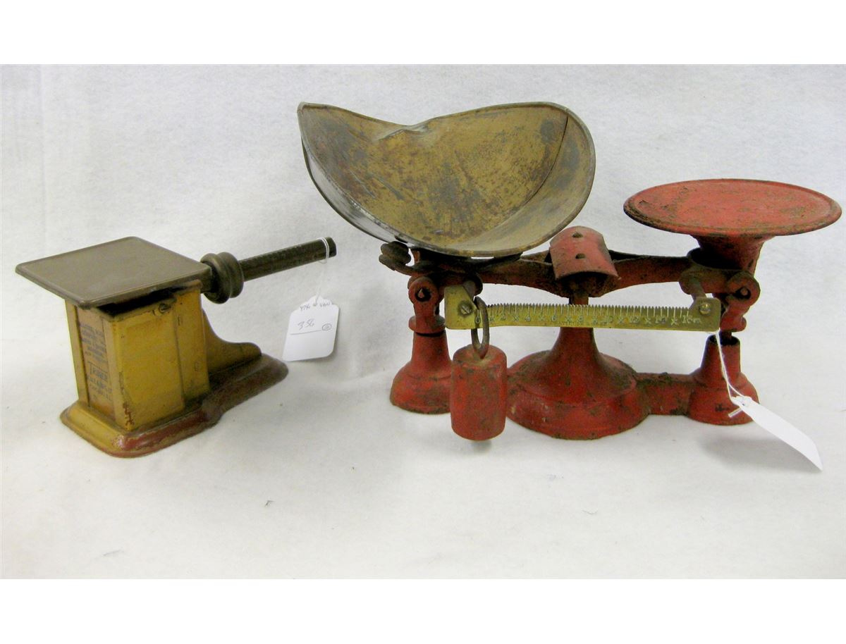Two balance scales including 1) Mail scale in steel and brass - weighs 0-9 oz - Signed Triner Scale & Mfg. Co., Chicago Ill - good working condition. 2) a cast iron countertop scale No.4, in newer red paint, slight bend in brass weight guage - good working condition - not signed.