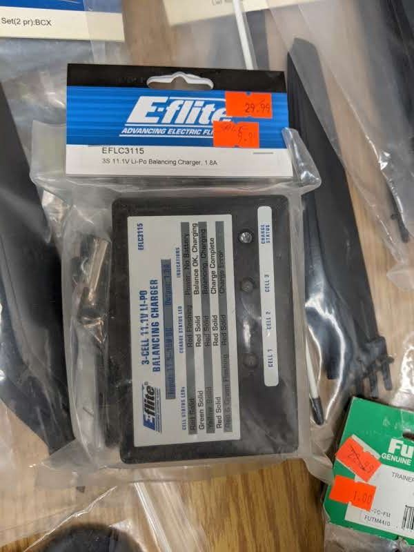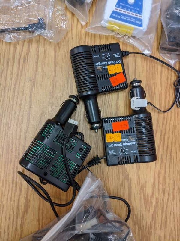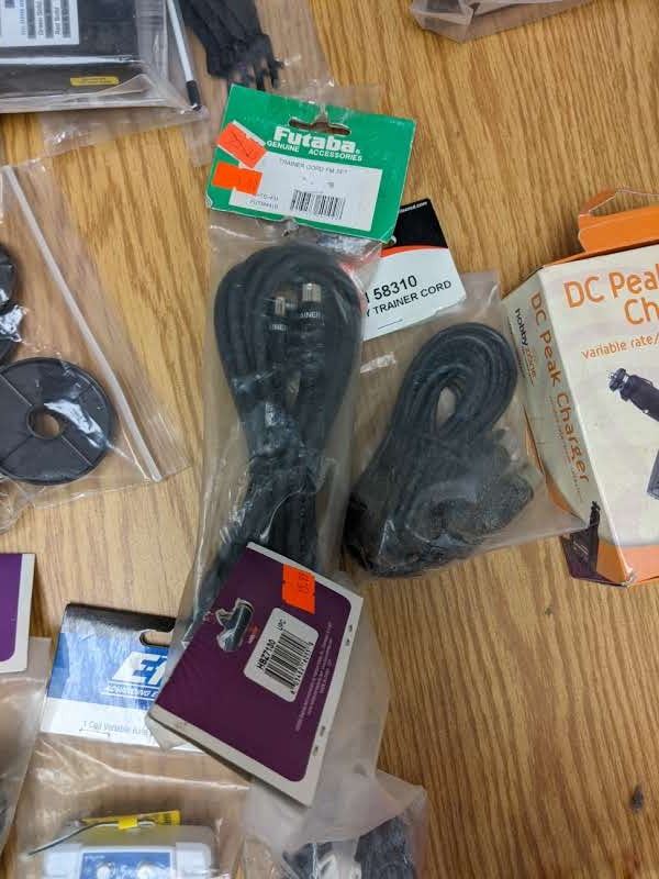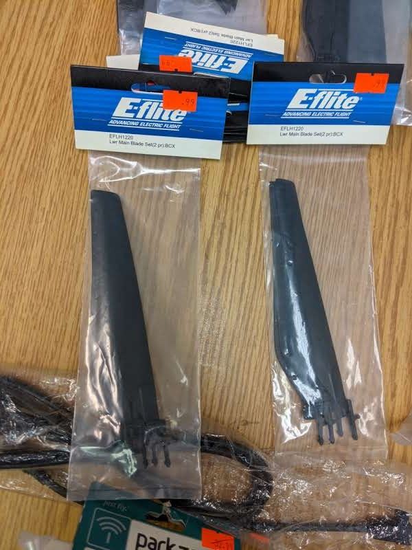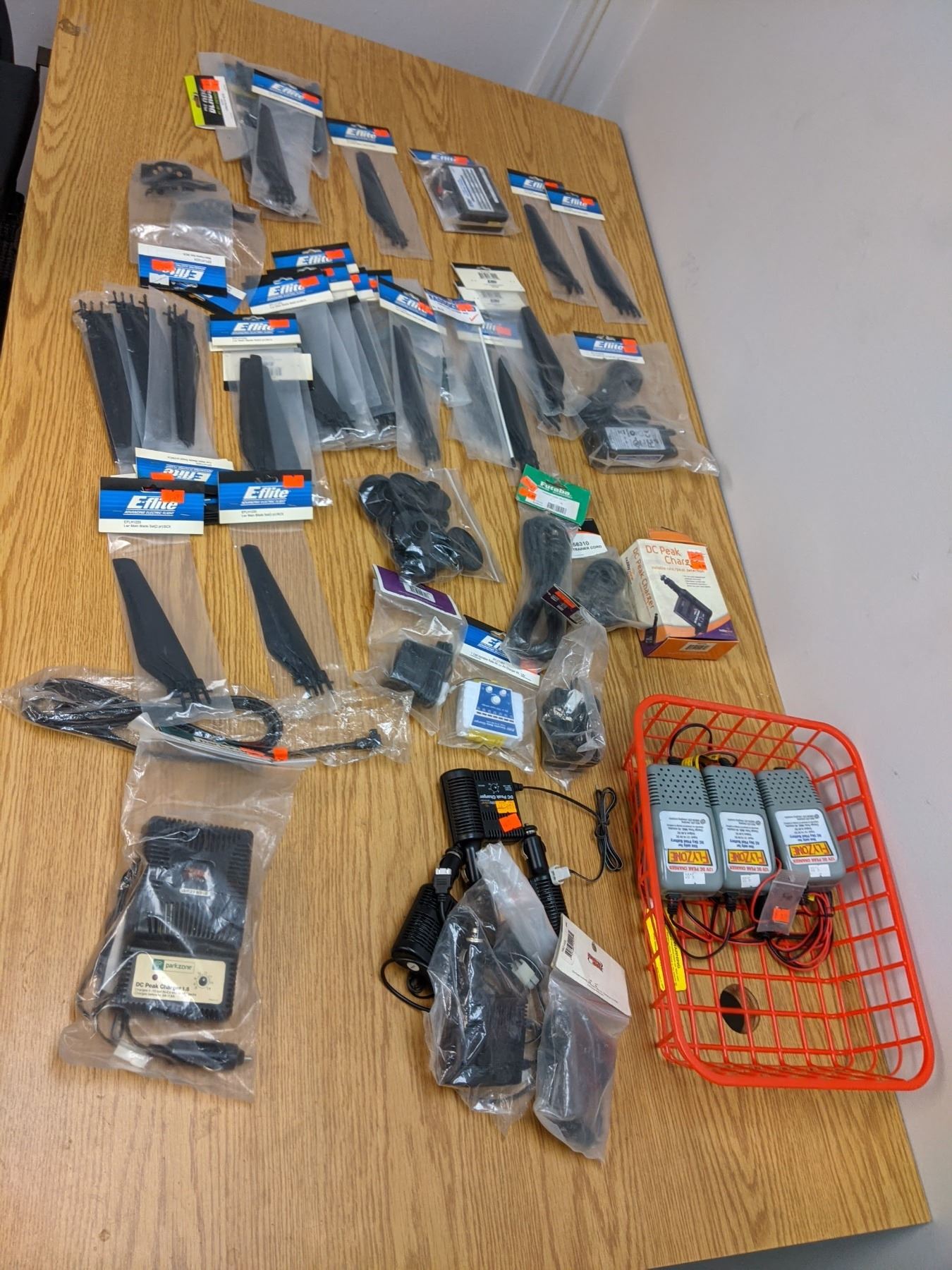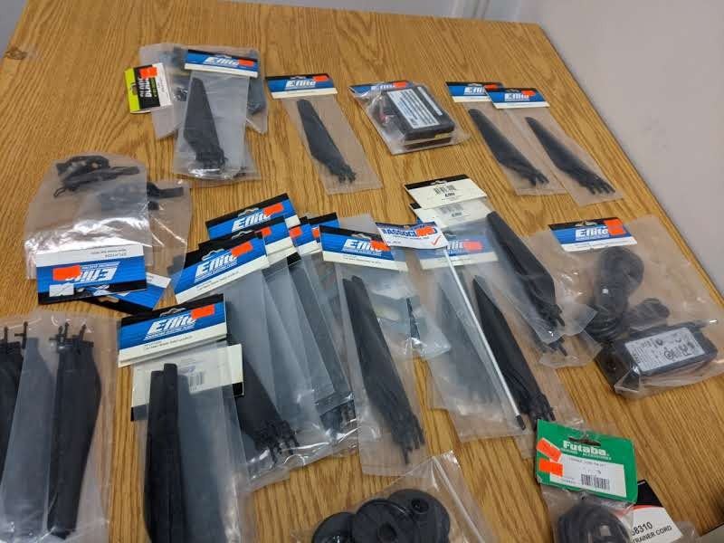 Two baskets of RC helicopter parts