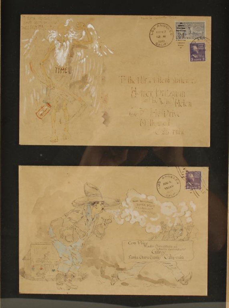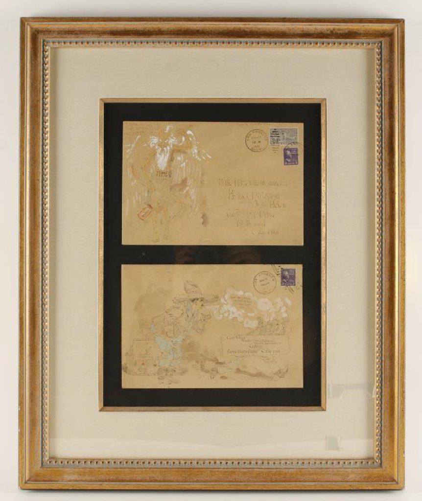 Two beautifully framed and matted illustrated letter envelops in the style of C. M. Russell, each postmarked “Los Angeles, Calif.”, both dated 1940; frame approximately 25” x 20” overall. The top envelop is addressed “To the Pair of Patient Sufferers/Homer Britzman and his Wife Helen/6630 Iris Drive, Hollywood, California” and shows an original watercolor sketch of Father Time and in the upper left corner of the envelop is the “return address”: “Some visitors don’t seem to know that I exist!!!!”. The second envelop shows an extensive watercolor sketch of a man in a cowboy outfit blowing smoke from a pipe at a fleeing subject with a Drug Store drawing in the background. In the smoke is written “That Britzman Super Flit ‘Tobacco’ mixture” and the “address” reads: Con Price/Radio Announcer and Tobacco connoisseur/Gilroy/Santa Clara County/California. Con Price was a friend and sometimes business partner of Charlie Russell; he was a cowboy and wrote a book entitled Memories of Montana. Homer Britzman
