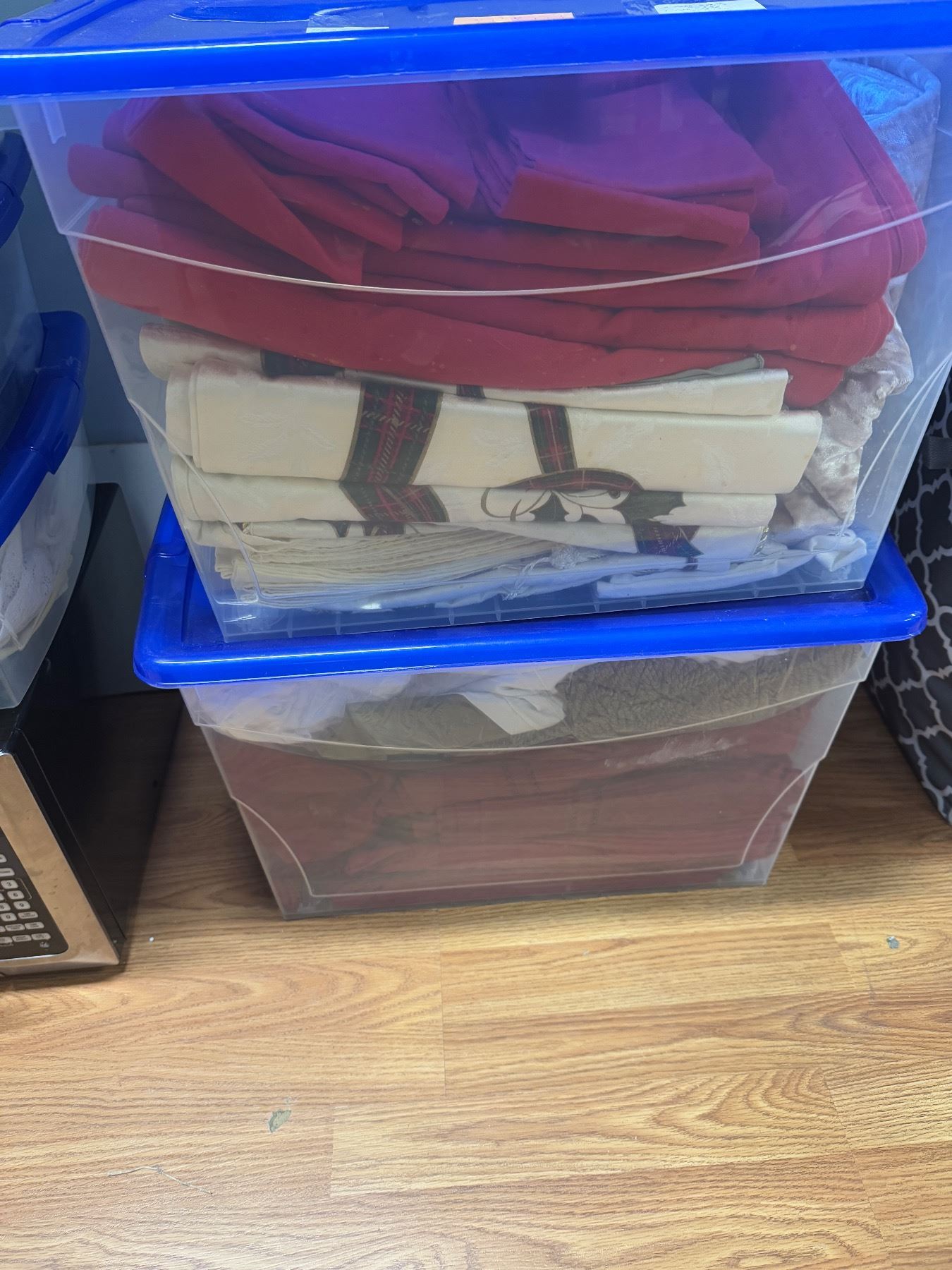 Two bins linens, tablecloth, napkins, table, runners, etc.