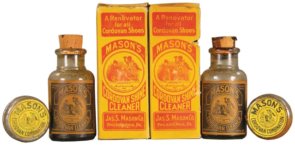Two bottles of Mason's Cordovan Shine Cleaner with original boxes and combination tins. Some missing ends to boxes and staining to corks and tins otherwise good condition. 5 1/2 inches tall. Start Price $20