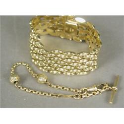 Two bracelets: an 18ct gold fancy gatelink, 18cm long, and a yellow metal belcher link Albert cha...