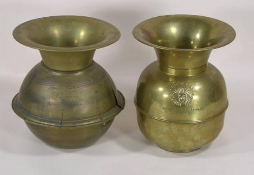 Two brass Spittoons including one Redskin Brand in good condition and one Union Pacific which shows considerable cracking.