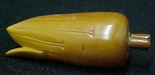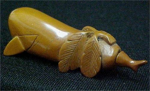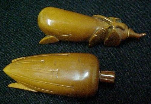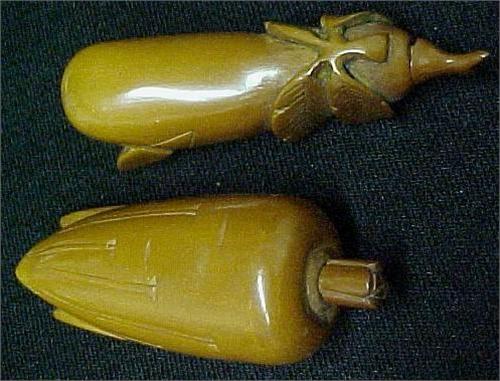 Two carved snuff bottles; naturalistic design; bottles rest on back feet; each 2 1/2: long plus stopper; one stopper needs minor repair