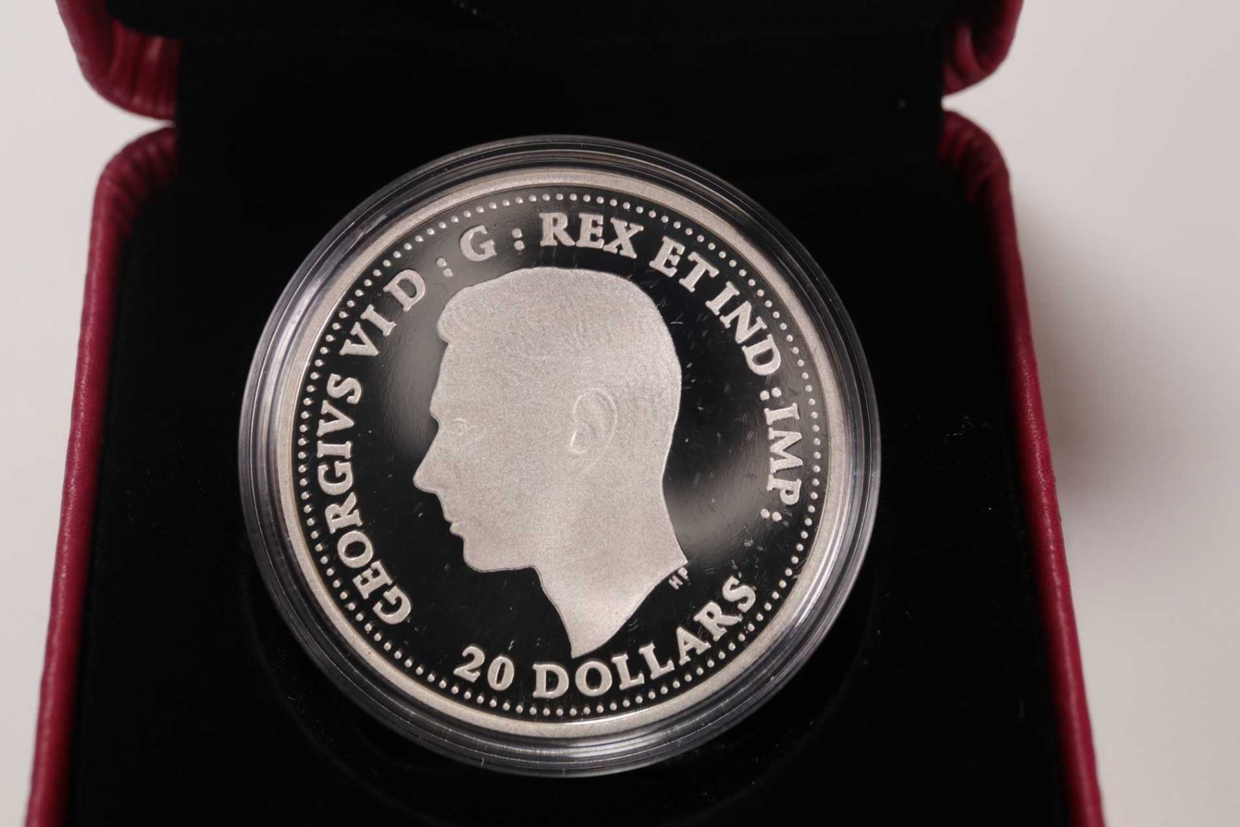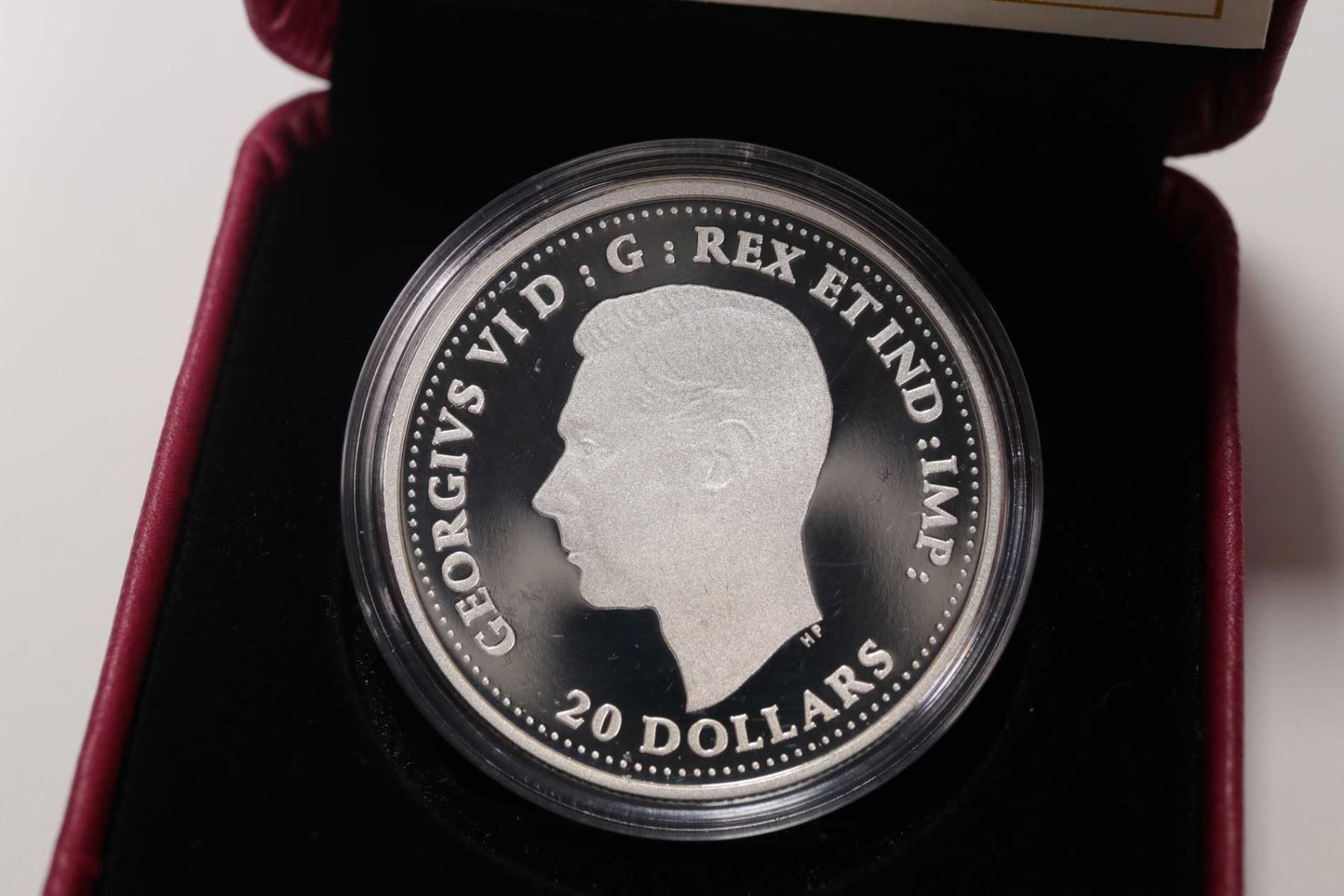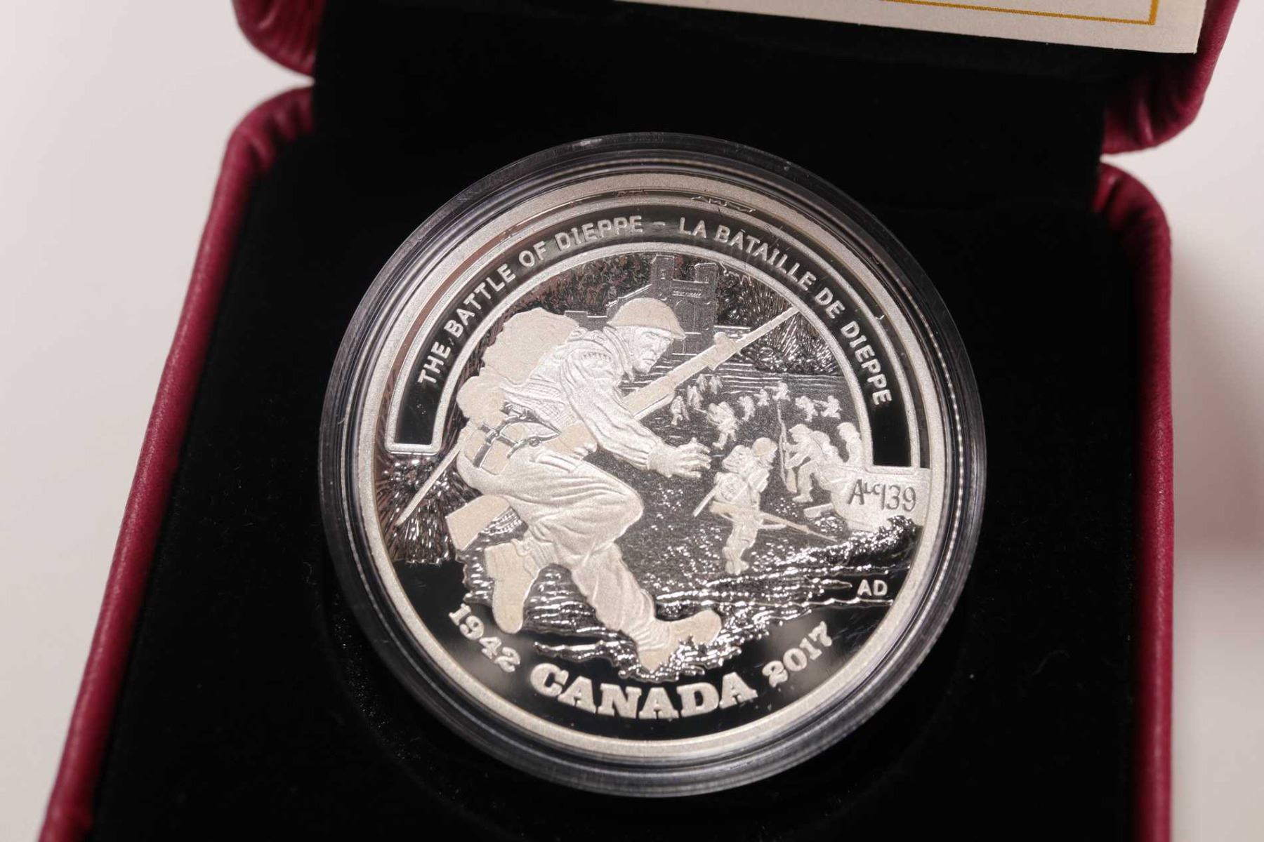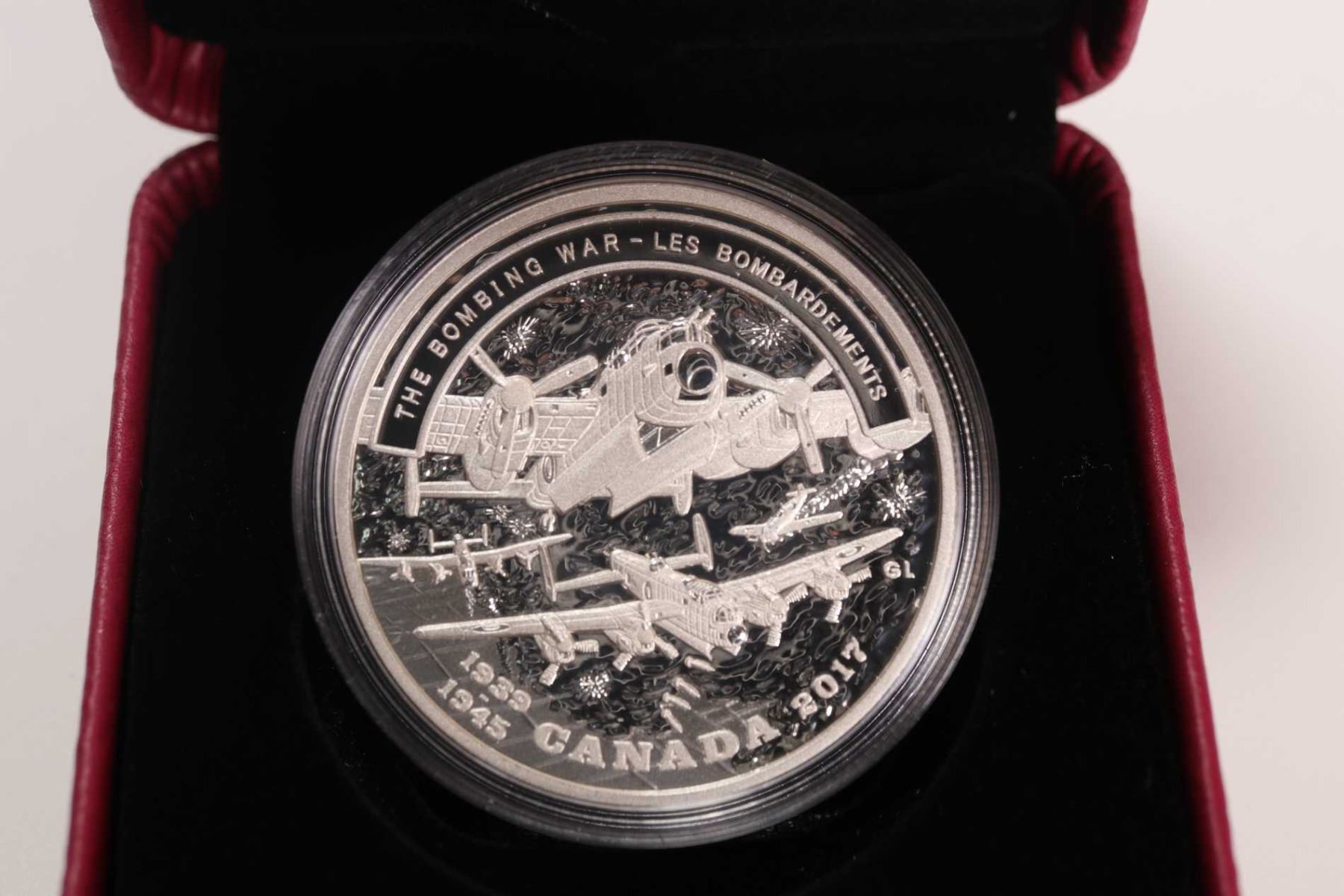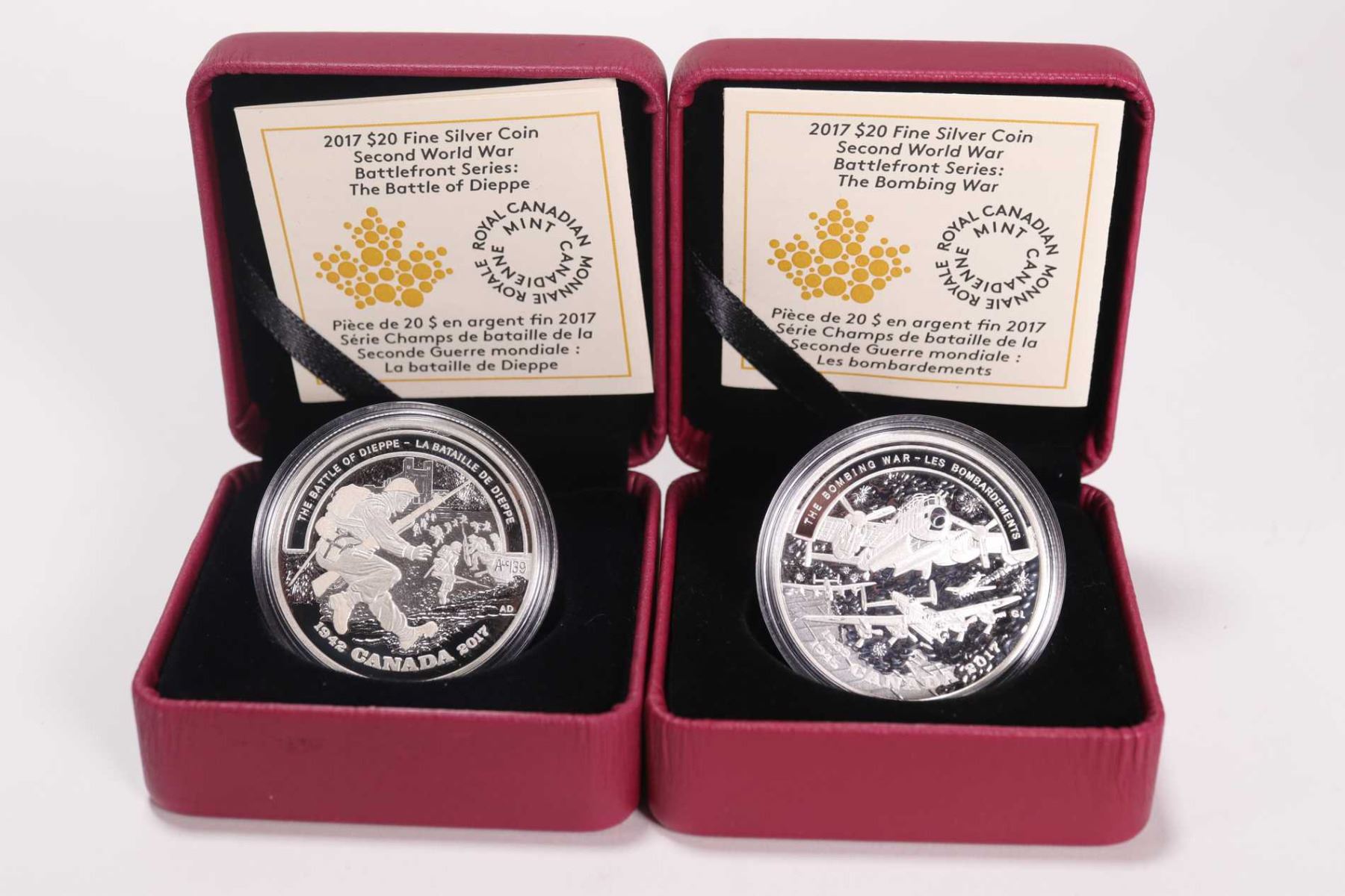 Two cased Royal Canadian Mint collector coins including 2017, $20 dollar, 31.39 gram .99.99% fine silver "Second World War, Battlefront series- The Bombing War" and the 2017, $20 dollar. 31.39 gram .99.99% fine silver "Second World War: Battlefront Series-The Battle of Dieppe"