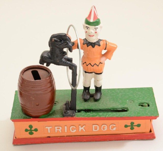 Two cast iron toy banks, one book of knowledge (quality reproduction), the other a Taiwanese reproduction. Est.: $50-$150.