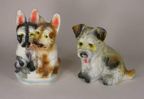 Two chalkware carnival prizes, Scotty dog figures, measuring 9 inches tall, both in good condition.