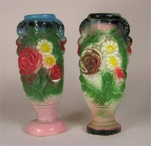 Two chalkware carnival prizes, floral pattern vases, approx. 12 inches tall, both in good condition.