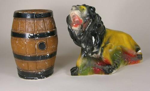 Two chalkware carnival prizes, lion and barrel, approx. 9 inches tall, both in good condition.