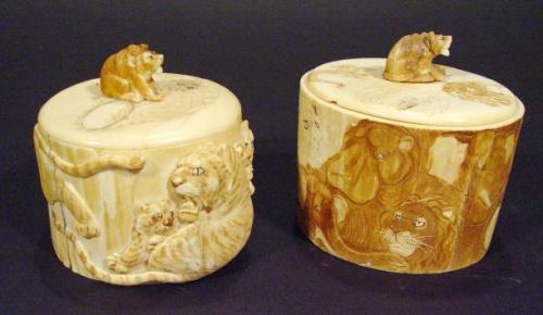Two circular oriental ivory boxes and covers, carved to the exterior with tigers, monkeys and elepha