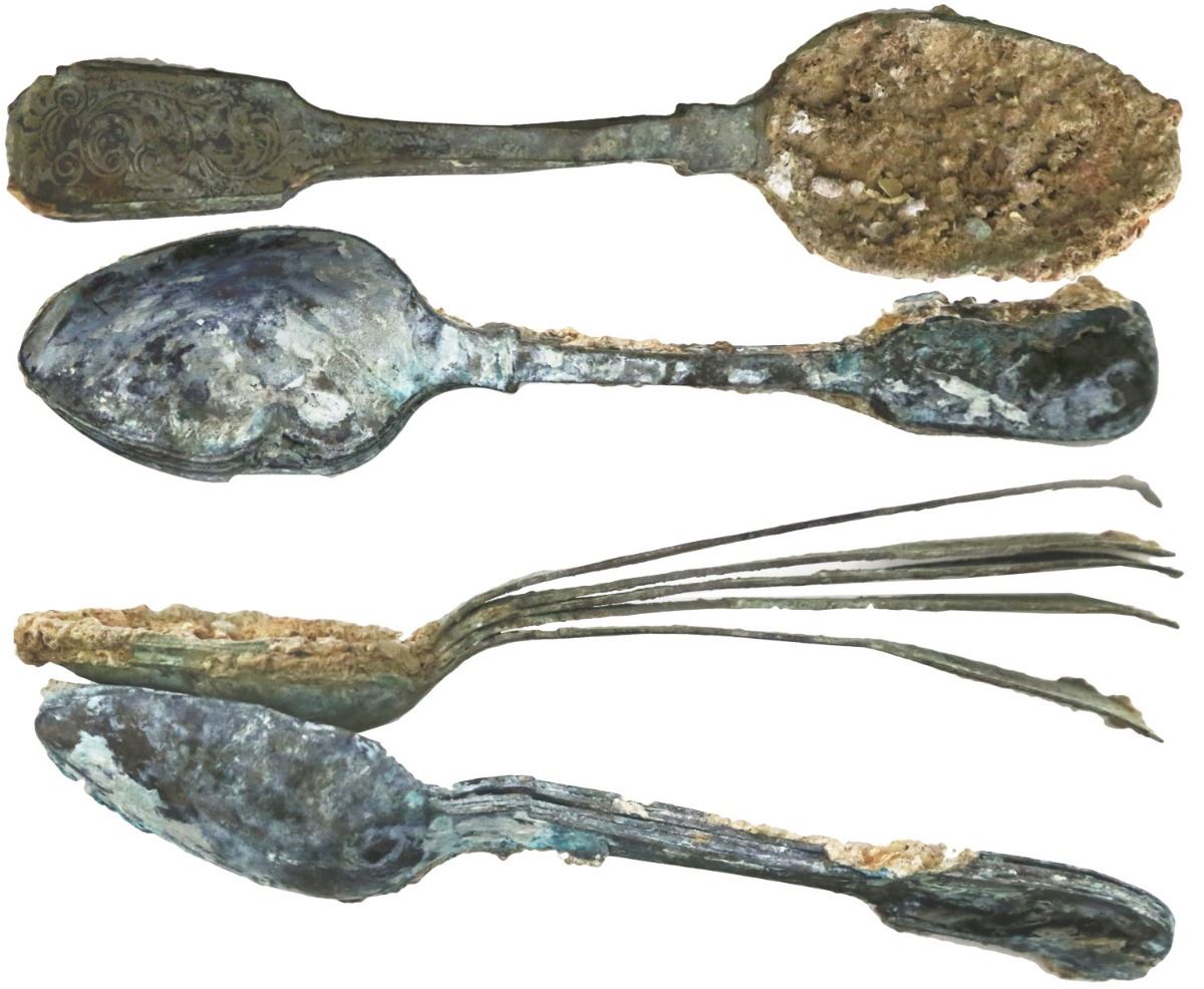 Two clumps of copper-alloy spoons (encrusted as found), 10 spoons total.