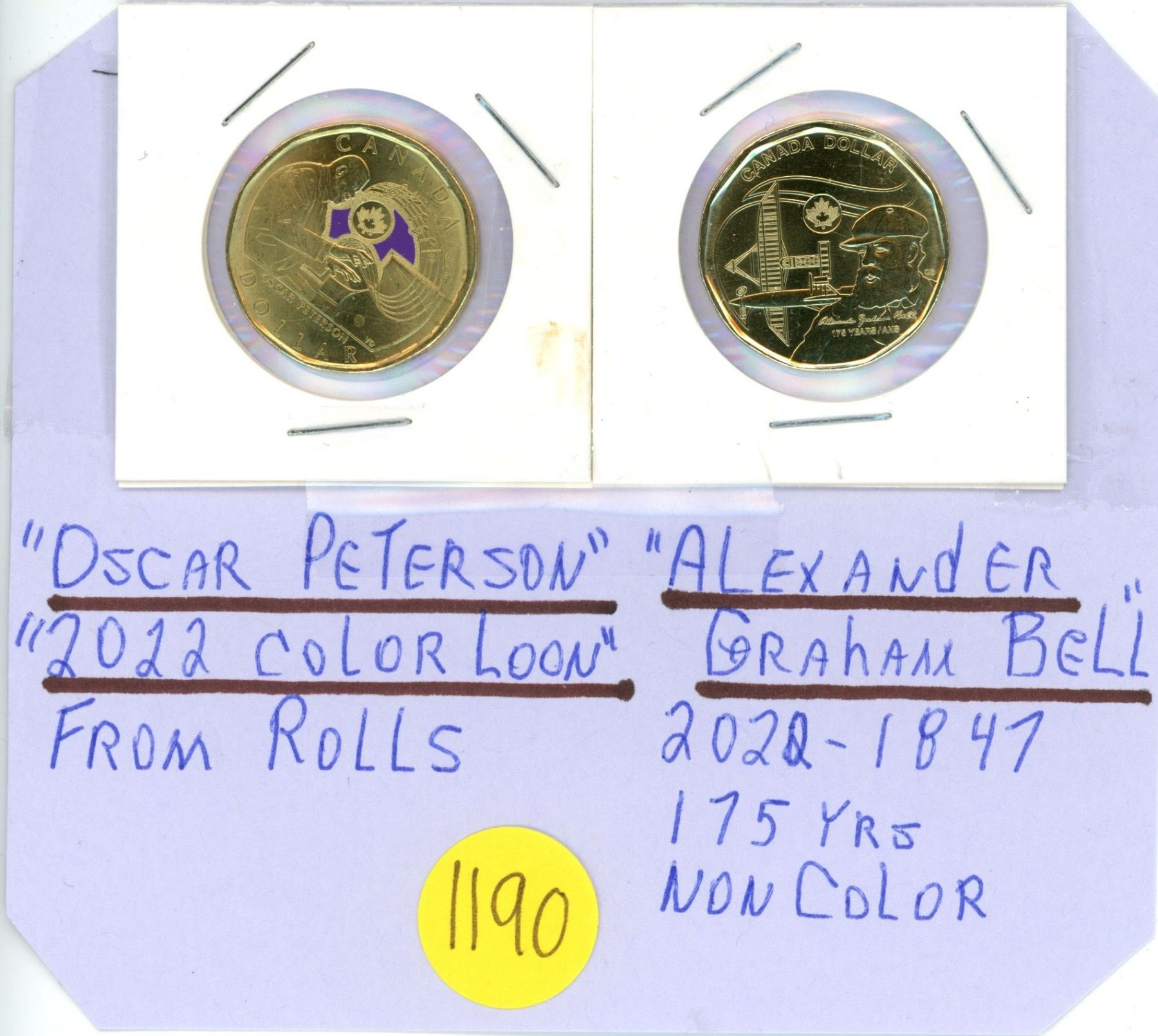 Two collectible Canadian $1.00 coins - Colourised Oscar Peterson 2022, Alexander Graham Bell 175 ann.