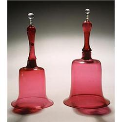 Two cranberry models of hand bells, each with a hollow handle and clear finial, 28cm & 29cm high, late 19th century (both lack clappers) (see illustration) £300-400