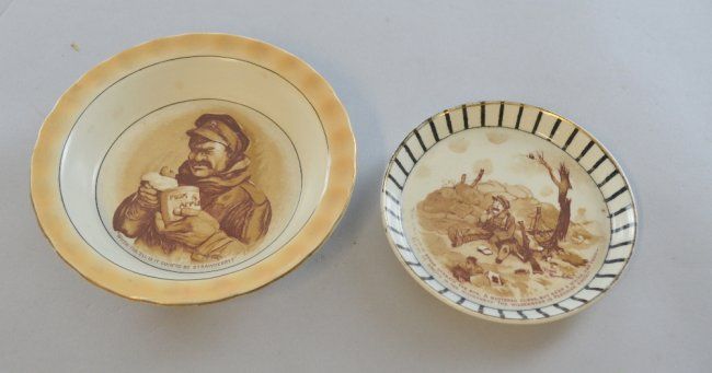 Two dishes with designs by Bruce Fairbrother, depicting WW1 scenes Grimwades dish stamped on reverse: Made by the girls of Staffordshire during the winter of 1917 when the boys were fighting in the trenches, fighting for liberty and civilisation.