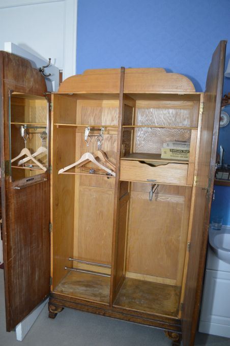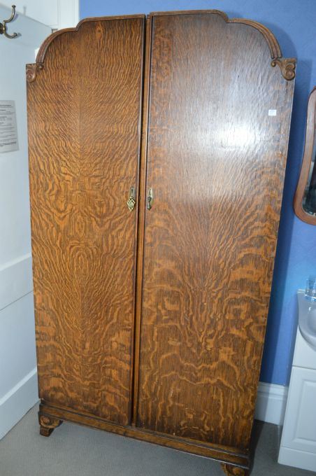 Two door oak wardrobe with door mirror, single drawer, three shelves and hangers.