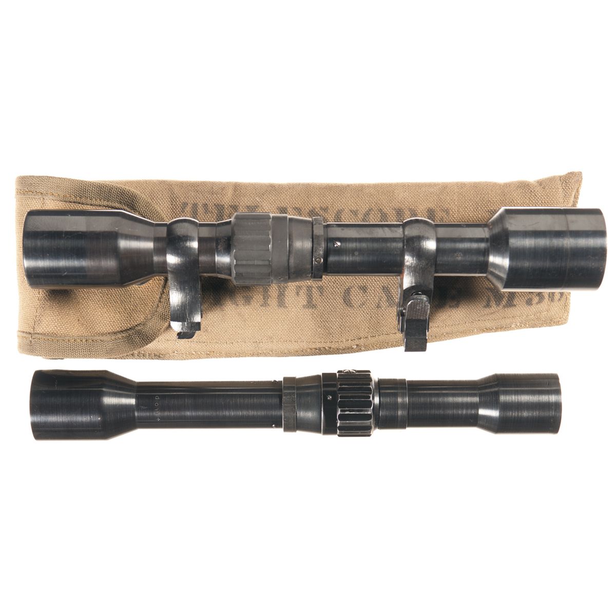 1) "dow t" marked scope with center focusing dial with claw mounts, optics are clear, 95% plus of blue finish remains. 2) :dow T" marked scope with center focusing dial, clear optics, 95% plus of blue finish remains with telescope M6 canvas case.