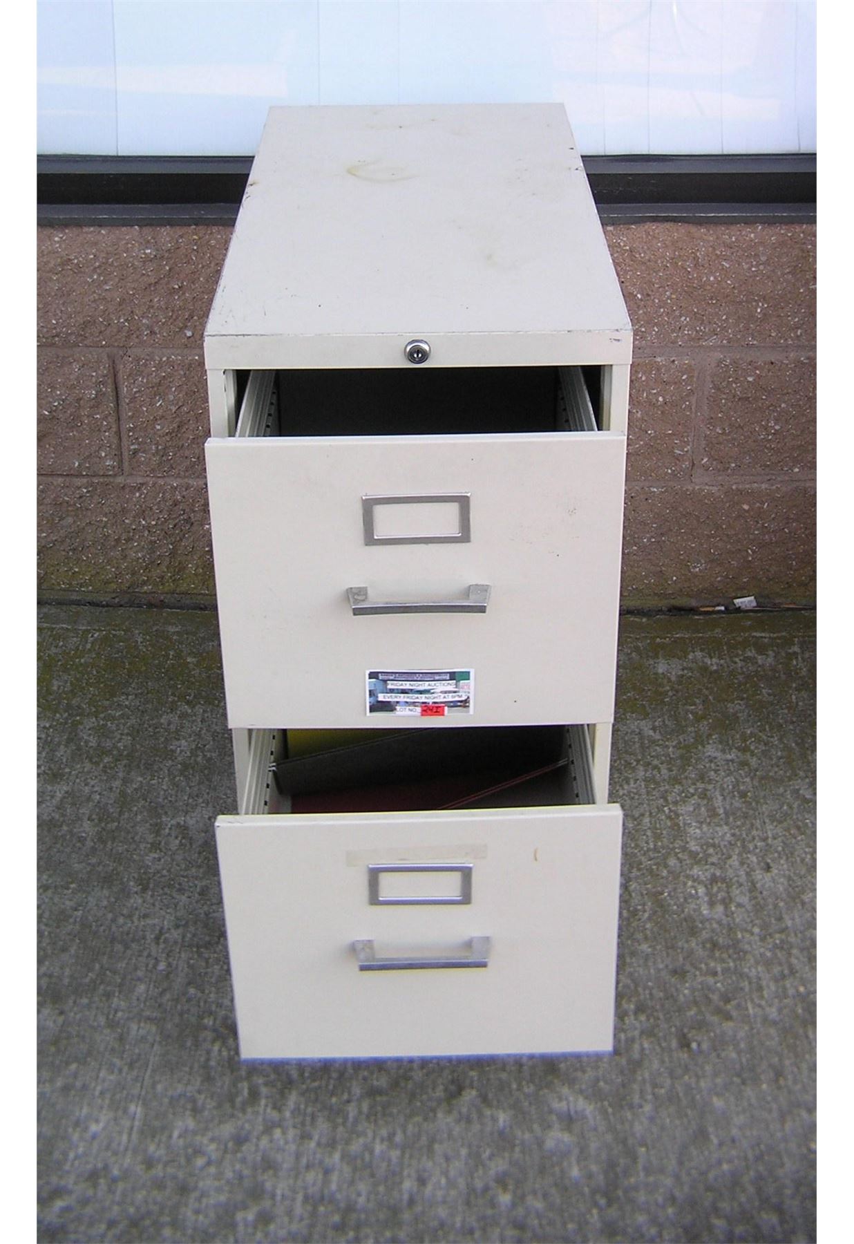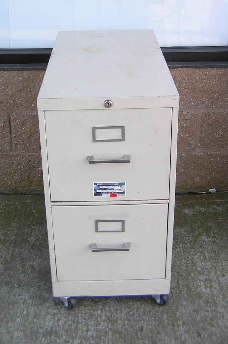 Two drawer file cabinet all metal on caster wheels part of a moving and storage company seized or unclaimed merchandise group sent to auction for liquidation est. value $50.00-$60.00