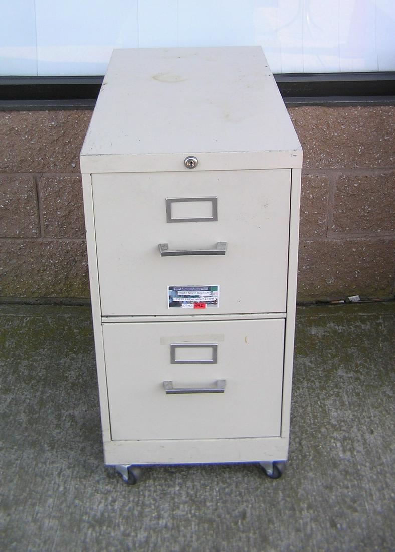 Two drawer file cabinet all metal on caster wheels part of a moving and storage company seized or unclaimed merchandise group sent to auction for liquidation est. value $50.00-$60.00