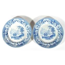 Two early 19th century Turner blue and white transfer printed Villager patterned pottery dinner plates, 27cm in diameter