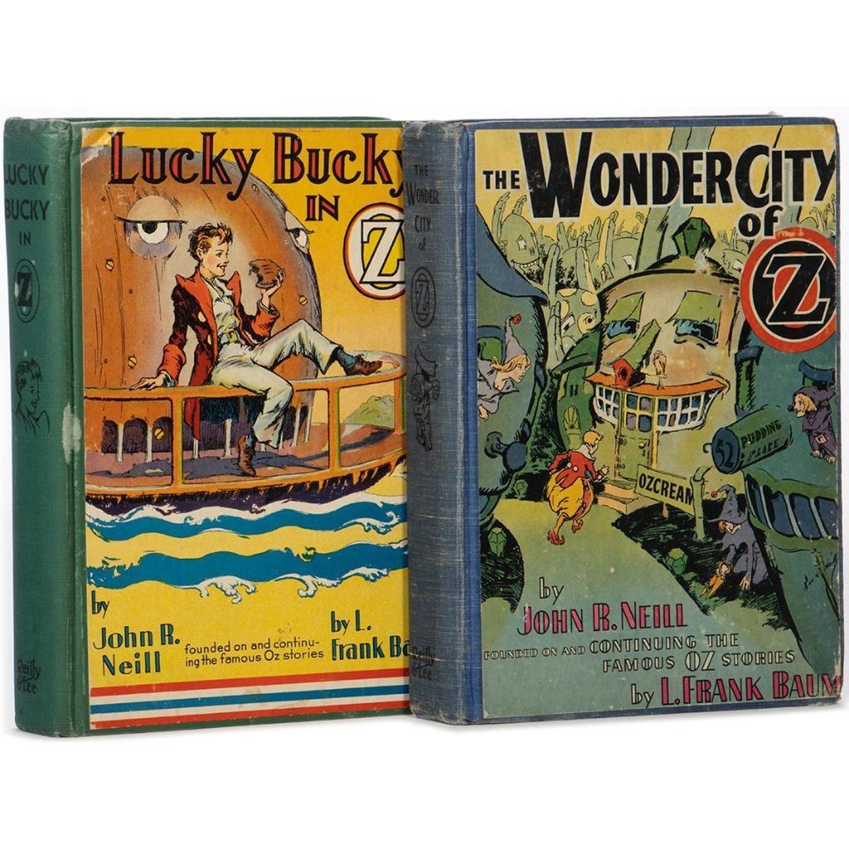 Two early edition John R. Neill Oz Books The Wonder City of Oz, written and illustrated by John R. Neill. Reilly & Lee 1940 but later with 32 page gatherings. lllustrated by Neill in black and white. Original dark blue cloth, pictorial cover label; black & white pictorial endpapers. Early edition. Together with Lucky Bucky in Oz, written and illustrated by John R. Neill. Reilly & Lee 1942 but later edition. Original green, pictorial cover label; black & white pictorial endpapers. Both about very good.