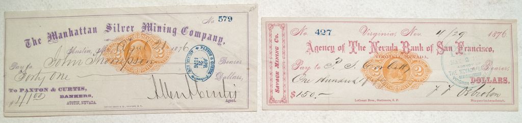 1) Agency of the Nevada Bank of San Francisco, Virginia, Savage Mine, 1876. 2) Paxton & Curtis, Austin, Manhattan Silver Mining Company, 1876.
