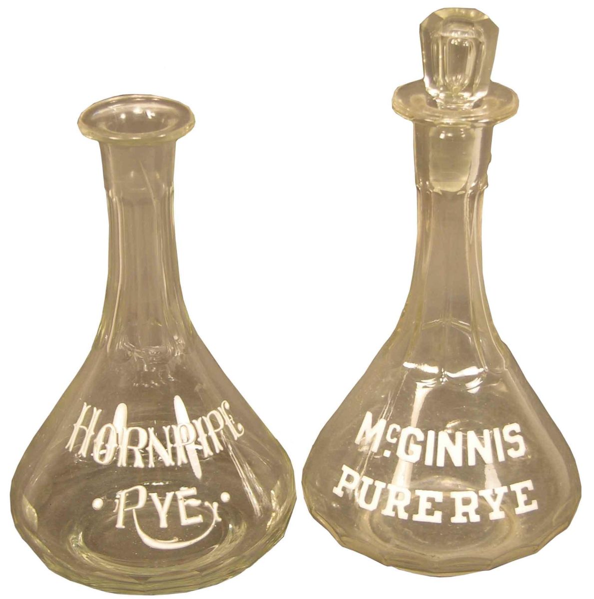 Two enamel label liquor decanters, Horn Pipe Rye and McGinnis Pure Rye. No chips or cracks. Aprox. 9 inches tall.