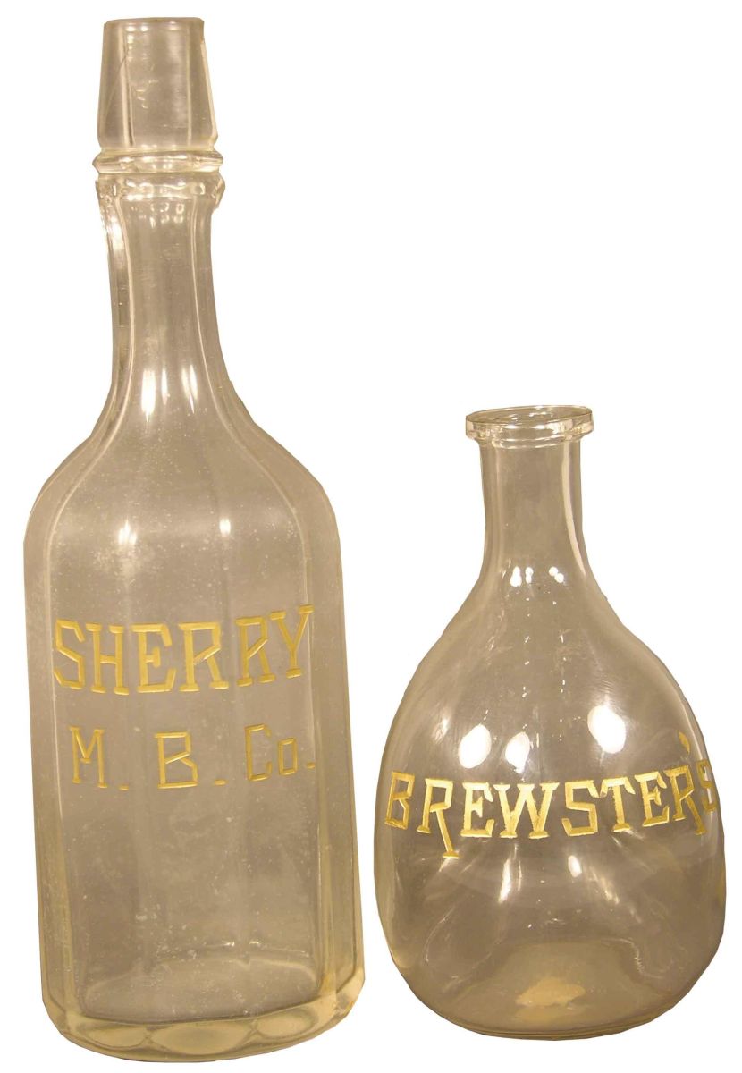 Two etched label liquor bottles, sherry & brewsters. No chips or cracks. 11 1/2 & 7 1/2 inches tall.